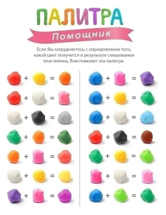 Пластилин представлен наборами из 12, 24 и 36 ярких цветов. Цвета можно смешивать между собой и создавать новые оттенки.