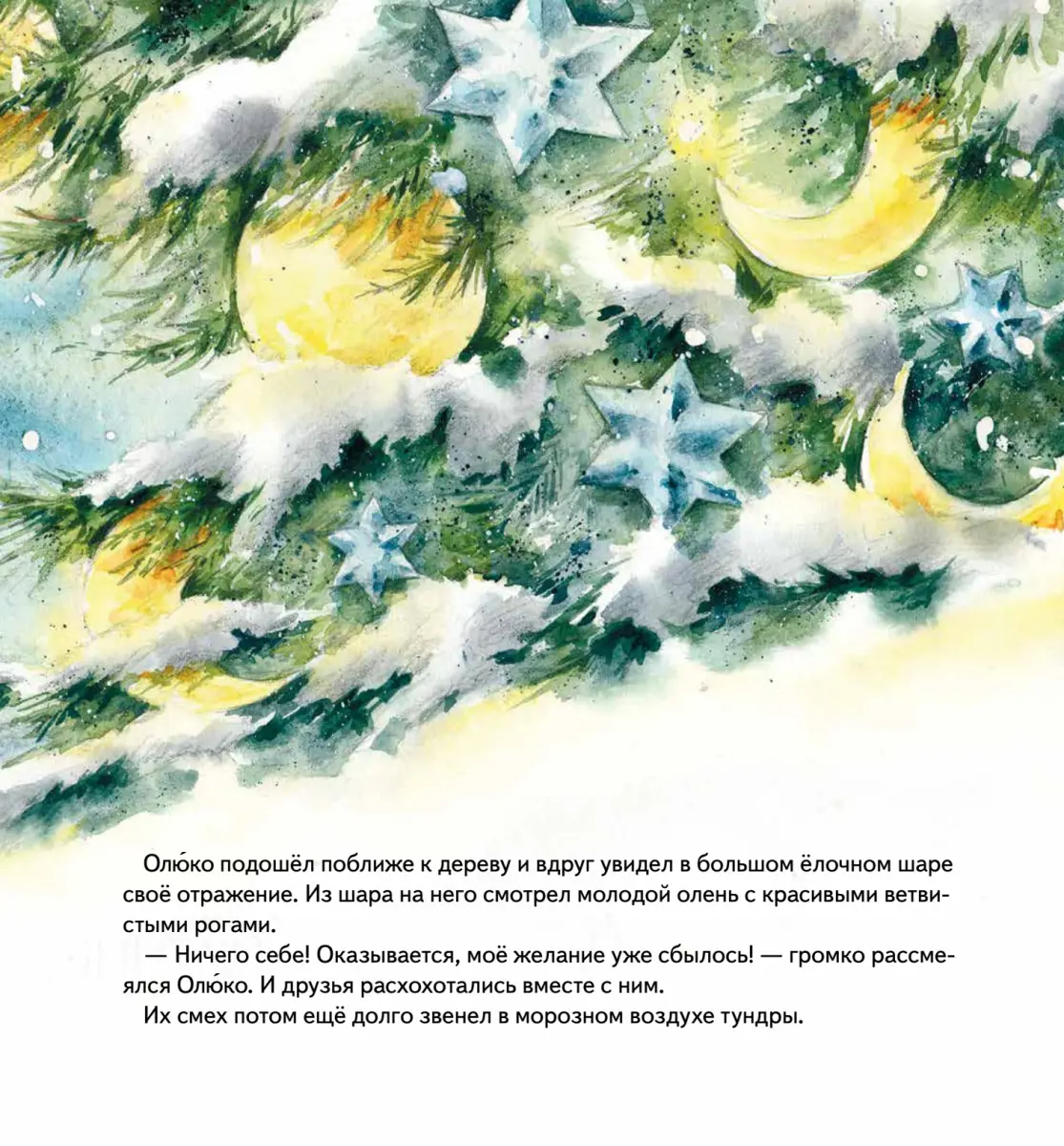 Оленёнок Олюко мечтает поскорее стать большим, чтобы носить такие же красивые ветвистые рога, как взрослые олени. Папа говорит, рога обязательно вырастут, как только Олюко научится быть смелым и решительным. Но ждать так тяжело! Проще загадать желание под волшебным звёздным деревом. И малыш отправляется вместе с друзьями на его поиски. Впереди оленёнка ждут отколовшаяся льдина, ночь в холодной и опасной тундре, спасение друзей и важное решение, от которого зависит - встретят ли они Новый год со своими семьями. Исполнится ли заветное желание Олюко? Об этом вы узнаете из доброй и волшебной истории. В книге вы найдёте не только новогоднюю сказку, но и полезную информацию об удивительном животном - северном олене. Для чтения взрослыми детям.