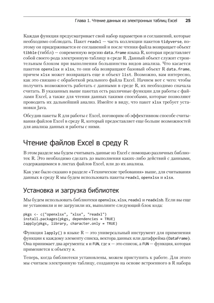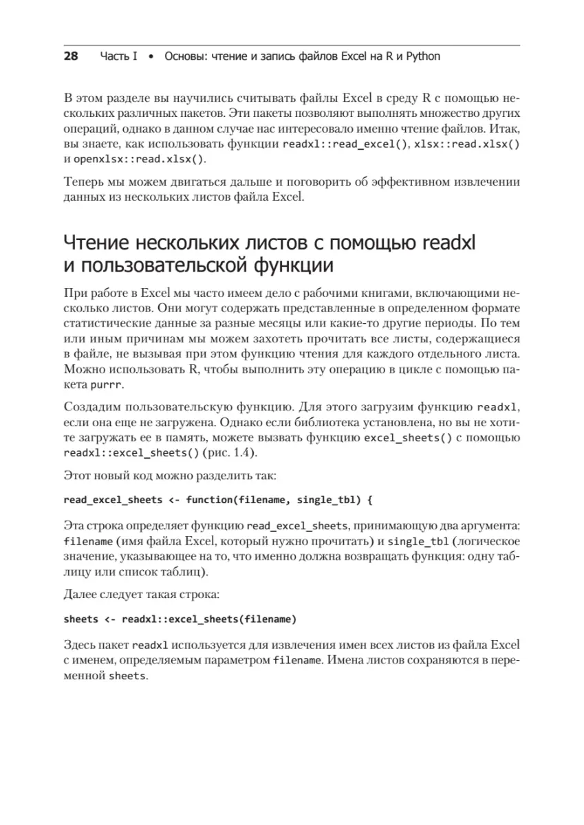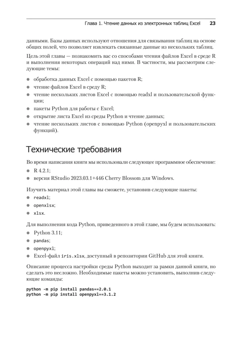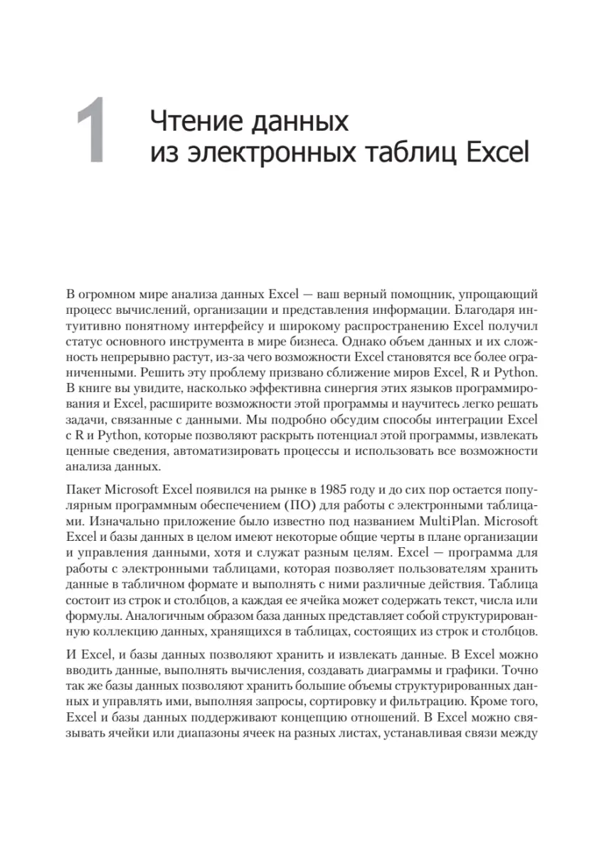 Анализ и визуализация данных имеют большое значение, именно они позволяют принимать обоснованные решения. Но в Excel достаточно много ограничений, которые превращают вашу жизнь в ад. «Excel с Python и R» меняет правила. Стивен Сандерсон — автор пакетов healthyverse для R, и Дэвид Кун — соучредитель Functional Analytics, компании, создавшей ownR (платформа для разработки решений на R, Python и других языках обработки данных). Интеграция Python и R с Excel изменит ваш подход к анализу данных с использованием электронных таблиц. Вы сможете автоматизировать задачи статистического анализа и создавать мощные визуализации, научитесь выполнять разведочный анализ данных и анализ временных рядов и даже интегрировать различные API для максимальной эффективности. И новички, и эксперты найдут в этой книге все необходимое, чтобы раскрыть весь потенциал Excel и поднять навыки анализа данных на новый уровень. К концу книги вы освоите приемы импортирования данных из Excel, манипулирования ими в R или Python, сможете решать задачи анализа данных в выбранном вами фреймворке и возвращать результаты обратно в Excel.