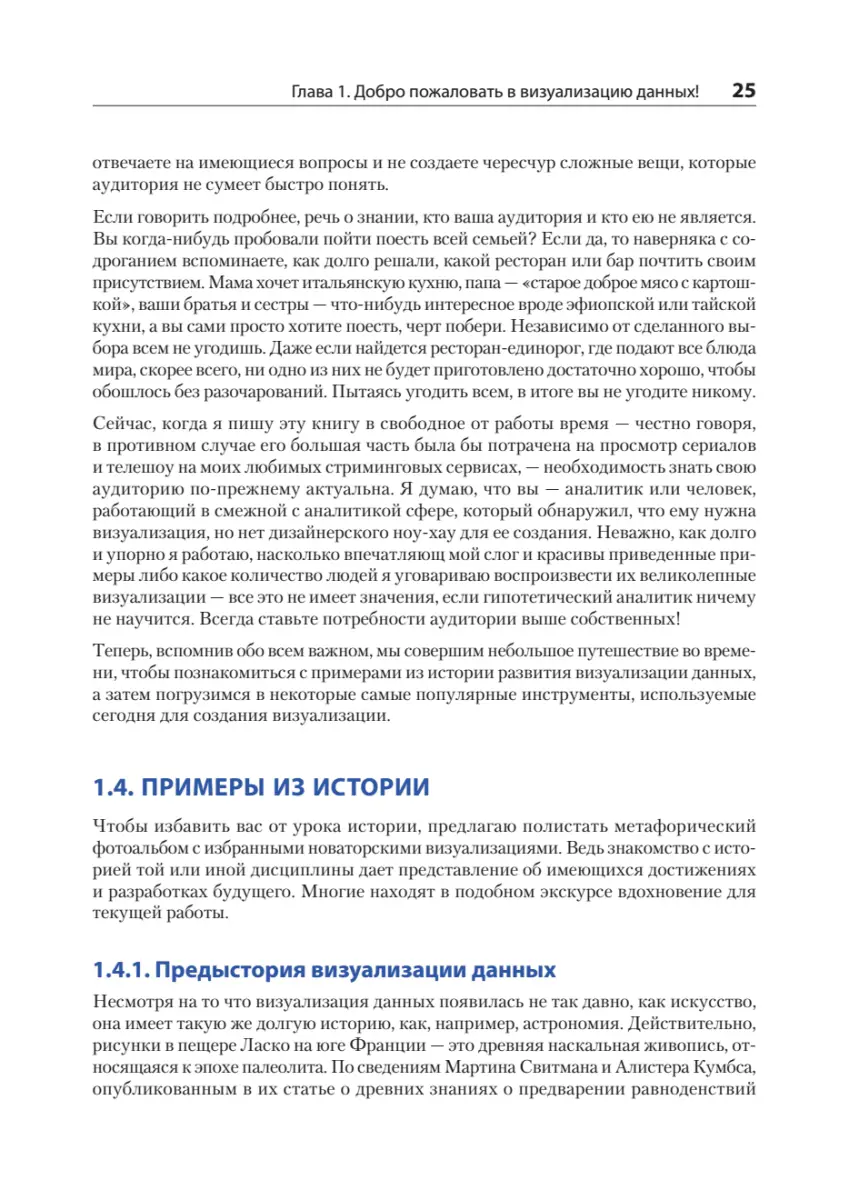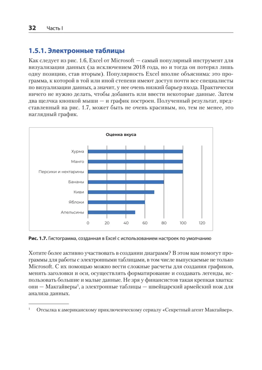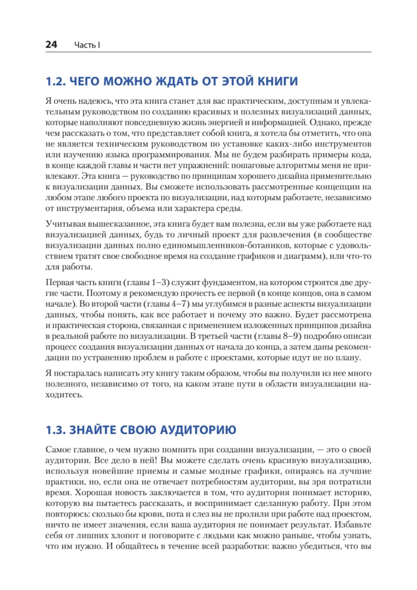 Даже самые обычные диаграммы, дашборды и инфографики могут поведать увлекательные и вдохновляющие истории о данных! В этой книге рассказывается, как усовершенствовать визуализации, которые вы создаете каждый день, улучшив макет и типографику, подобрав правильные сочетания цветов и обеспечив доступность для людей с ограниченными возможностями. Вы откроете для себя нестареющие принципы дизайна, которые помогут вам выделить важные признаки, компенсировать недостаток информации и организовать интерактивное взаимодействие с потоками постоянно обновляемых данных. Книга «Визуализация данных для профессионалов» познакомит вас с основами графического дизайна применительно к наиболее распространенным типам визуализации данных. Вы узнаете, как подобрать правильные сочетания цветов для диаграмм, побудить пользователей начать взаимодействовать с данными и исследовать их, создавая визуализации, доступные для всех, в том числе для людей с ограниченными возможностями. Попутно вы будете практиковать каждый новый навык, развивая проект дашборда от начального исследования до публикации.
