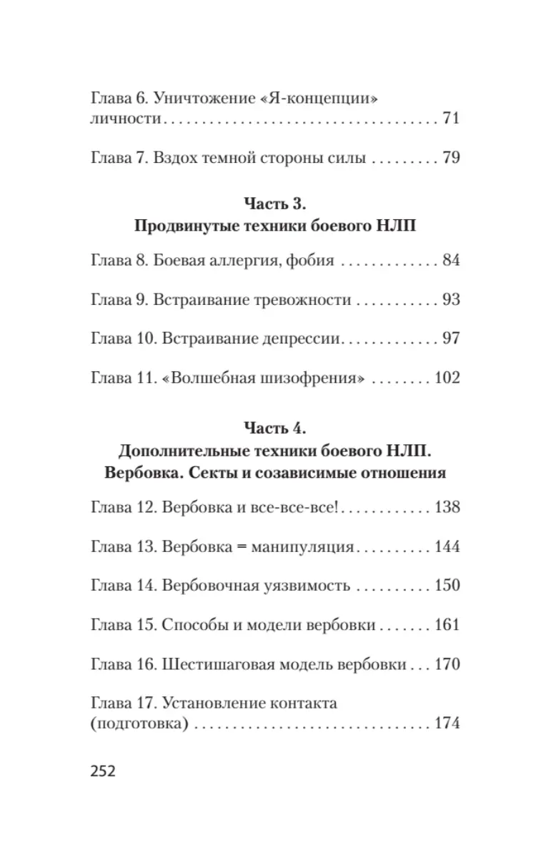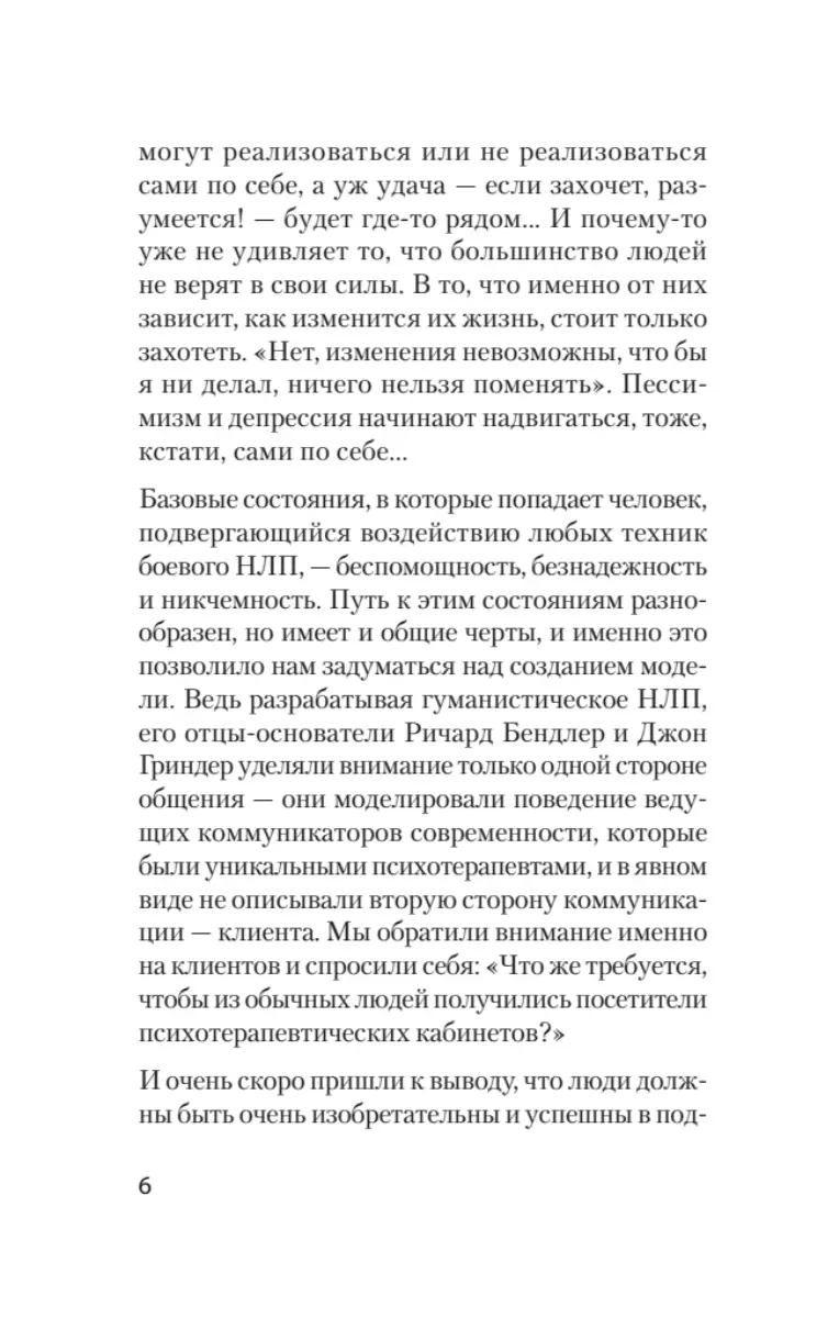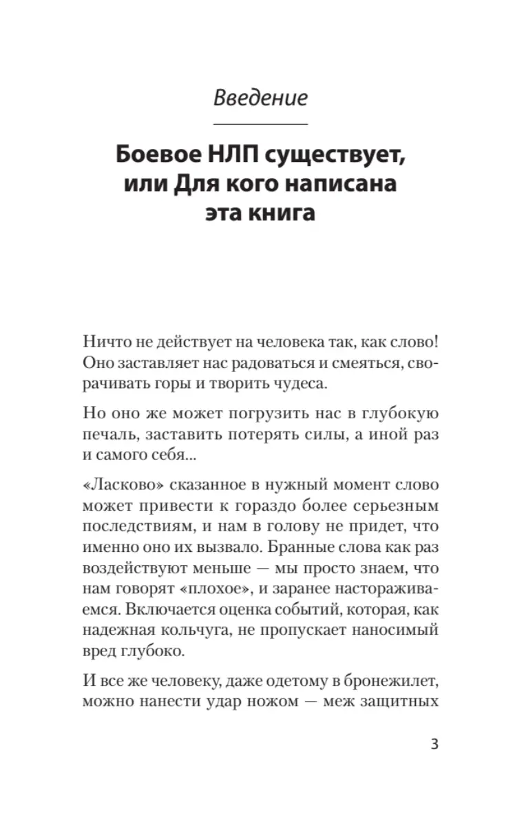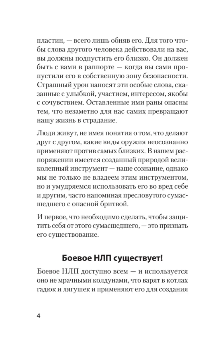 Ничто не действует на человека так, как слово! Оно заставляет нас радоваться и смеяться, сворачивать горы и творить чудеса. Или может погрузить нас в глубокую печаль, заставить потерять силы, а иной раз и самого себя. Боевое НЛП представляет собой набор самых жестких и опасных методов управления поведением людей и доступно всем. При этом чаще всего приемы боевого НЛП используют те, от кого мы этого меньше всего ожидаем: наши друзья, родные, близкие и просто знакомые. Не со зла, они и не догадываются об отдаленных последствиях коммуникации такого типа. Изучив техники и модели скрытых манипуляций, вы увидите, как именно слова воздействуют на вас, и вы будете настороже, а значит, сможете защититься! Книга рекомендована всем, кто желает научиться управлять поведением и мотивацией людей, а также уберечь себя и близких от негатива окружающих.