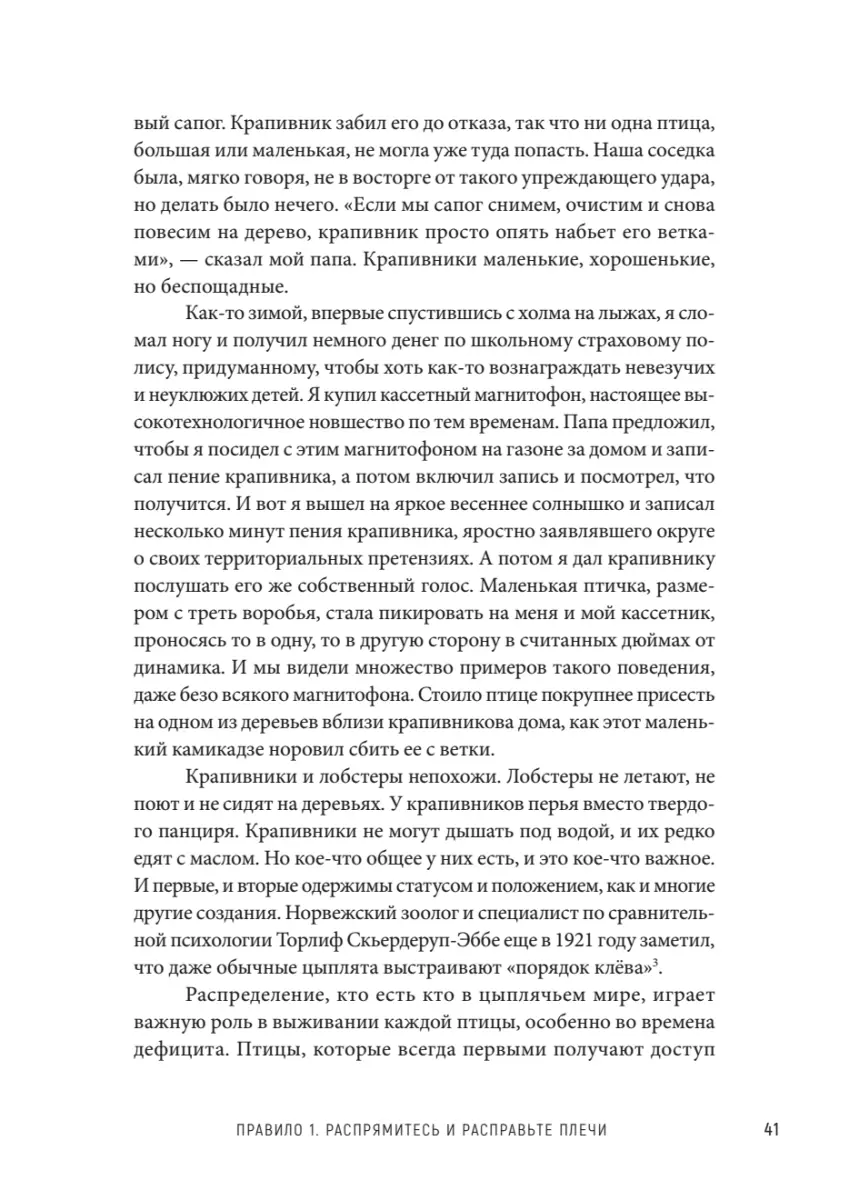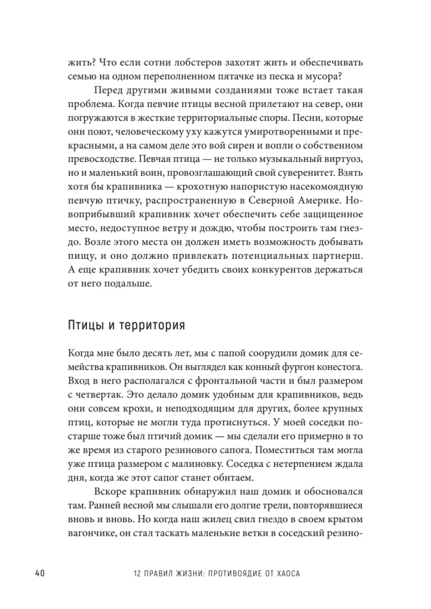 Современный мир — это цитадель порядка или царство хаоса? Мы появляемся на свет, чтобы стать вольными художниками Бытия или следовать универсальным Правилам? Отвечая на сложнейшие вопросы мироустройства, доктор Питерсон мастерски сплетает постулаты древних учений, великие литературные произведения и откровения современной науки и философии. Лобстеры непреклонны и тверды, защищая свою территорию. Шимпанзе кровожадны и склонны к иерархии. Кошки дружелюбны, но живут сами по себе. Не теми ли путями идут люди, балансируя между добротой и озлобленностью, великодушием и обидой благородством и мстительностью? «12 правил жизни» — 12 бездонно простых истин, мудрые законы существования, низвергающие стереотипы и облагораживающие разум и дух читателя. Джордан Питерсон — клинический психолог, философ, профессор психологии Университета Торонто. Занимается исследованием идеологии, религии, тоталитарных систем, личности и сознания. Его лекции и выступления набирают миллионные просмотры на YouTube, что сделало этого харизматичного преподавателя и мыслителя настоящим кумиром современной интеллектуальной молодежи.