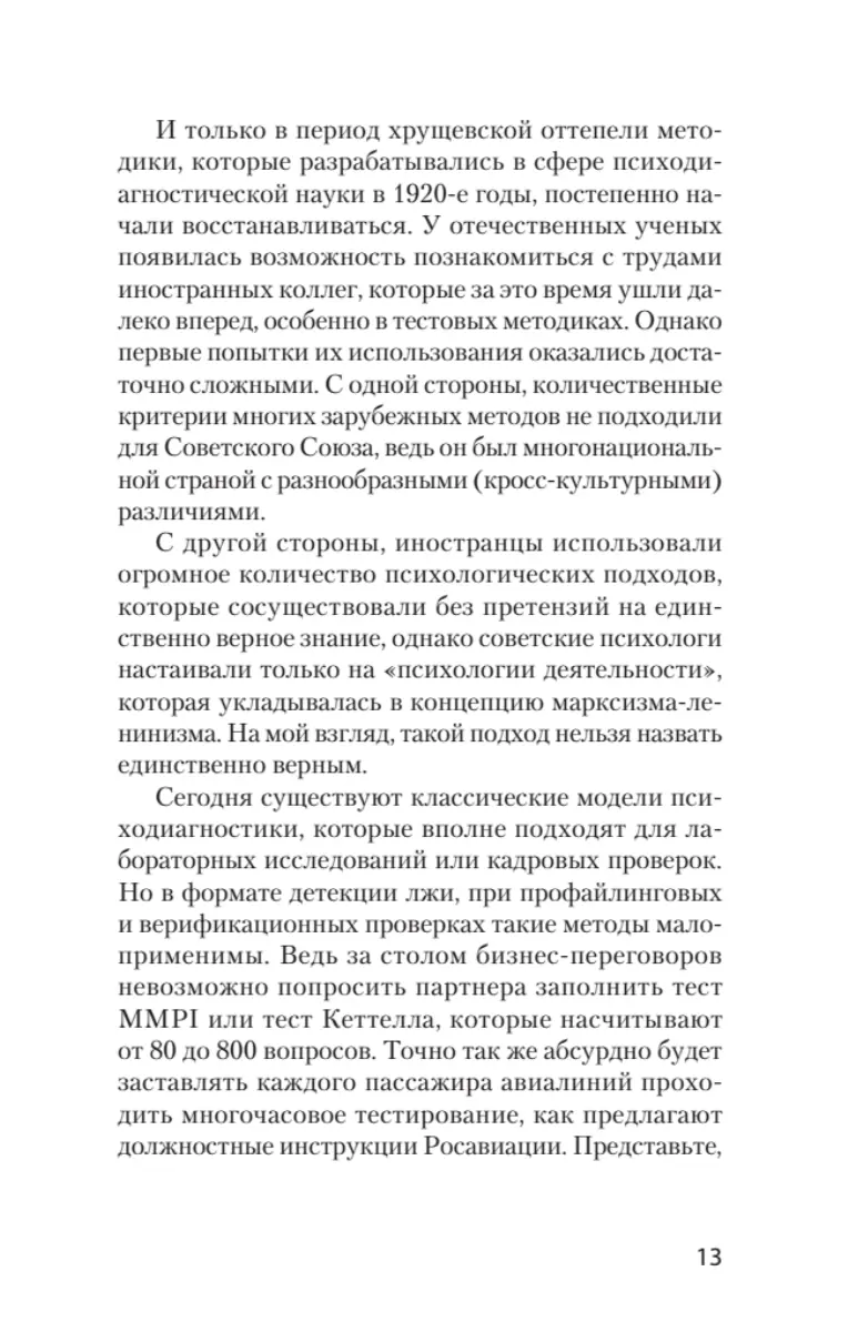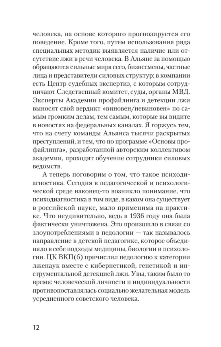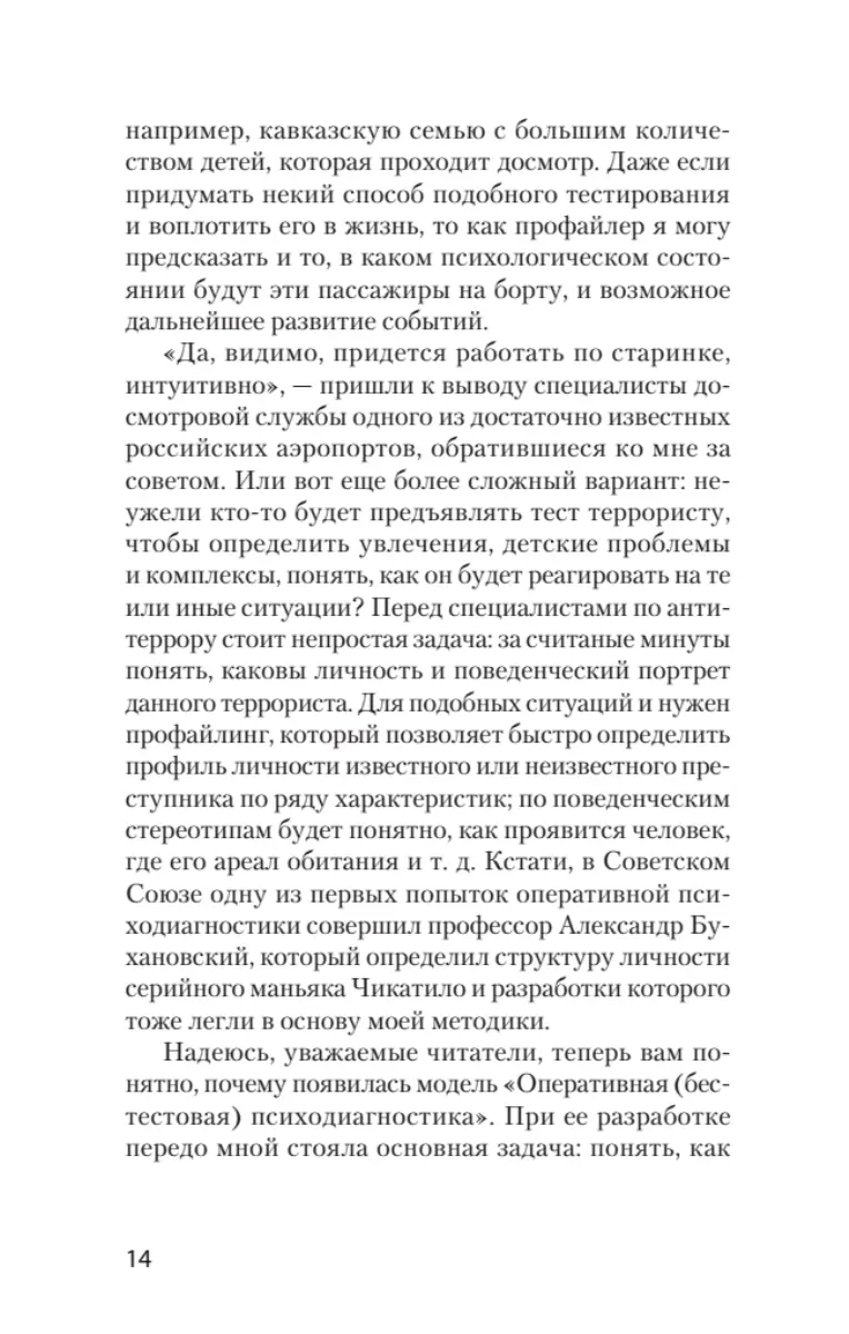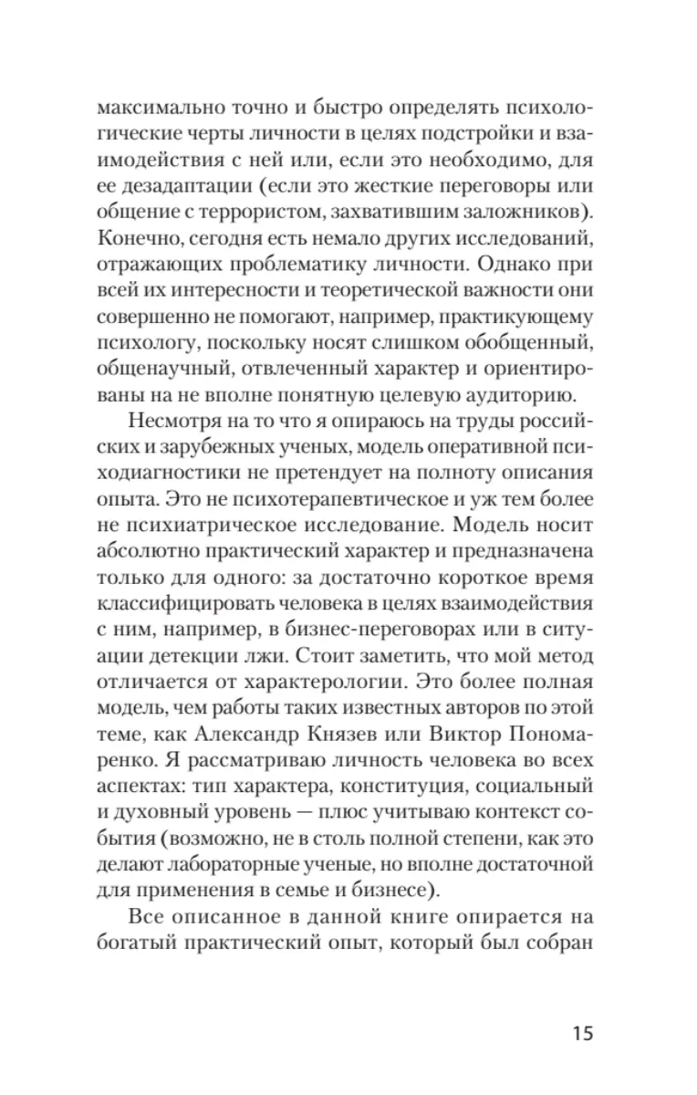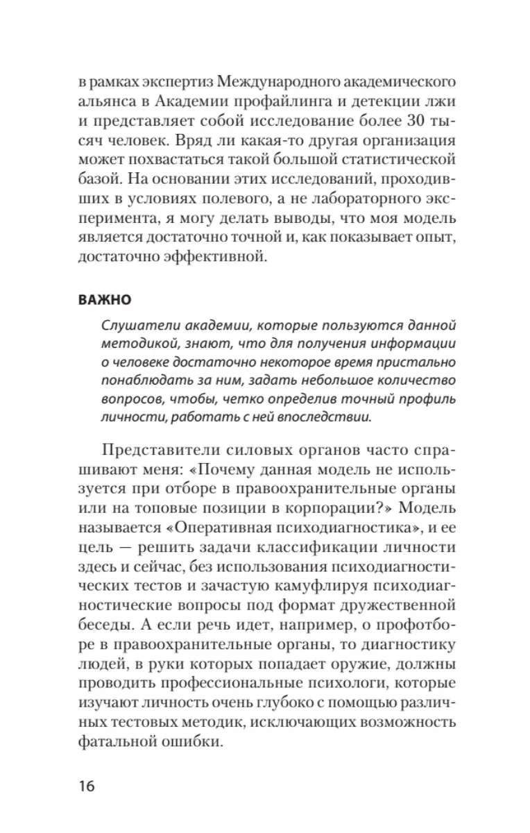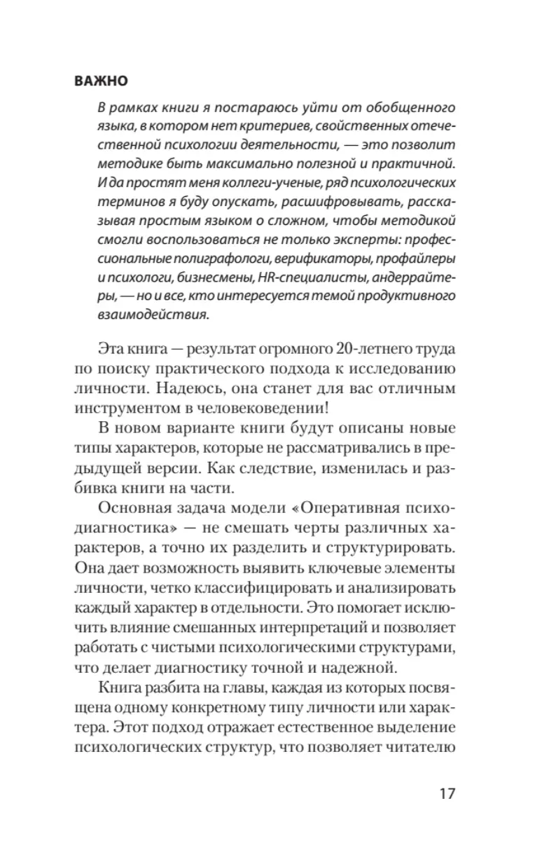 Хотите узнать секреты спецслужб по прогнозированию поведения человека? Или, может быть, желаете выяснить всю правду о человеке, не используя психологические тесты? Стремитесь правильно подобрать кандидатуру на должность за несколько минут? Авторская методика оперативной психодиагностики поможет точно и быстро оценить человека менее чем за 2 минуты общения — понять, кто перед вами, каков его поведенческий портрет, как он будет реагировать на те или иные ситуации. Метод может быть использован для того, чтобы максимально точно и быстро подстроиться под собеседника или оппонента, а при необходимости — даже дезадаптировать его (например, в случае жесткой беседы, сложных переговоров или общения с преступником или террористами). Популярное издание дополнено информацией о психотипах, и теперь все 13 психотипов подробно разобраны, чтобы понимать выбор лучших ролей в команде, создавать и получать идеальные условия для жизни, общения и работы. В новом издании представлены рекомендации книг и фильмов в качестве упражнений для лучшей калибровки психотипов. Упражнения направленны на "прокачку" в себе того или иного психотипа для того, чтобы развить коммуникативную гибкость и быть более успешным.