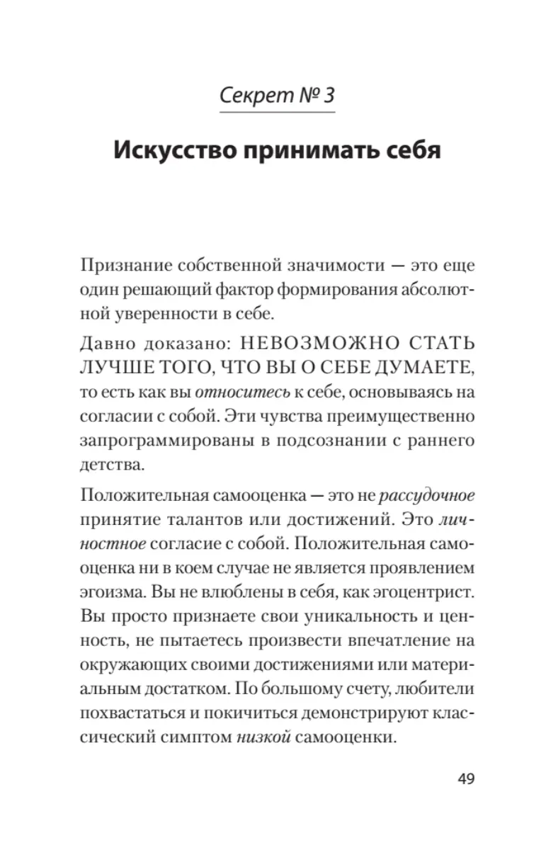 Как добиться абсолютной уверенности в себе? Те, кто советует вам воспитывать силу воли, правы, но они не так далеко продвинулись на пути к цели. Одного решения преуспевать и вести более плодотворный, творческий образ жизни недостаточно, ибо оно не затрагивает суть проблемы, которая заключается в ошибочном восприятии. Как только мы правильно оценим положение вещей и истолкуем свое окружение в истинном свете, мы сможем изменить себя. Только изменив себя, можно обрести стопроцентную уверенность в себе!
