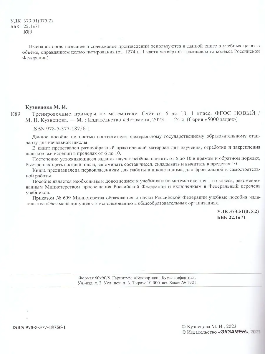 В книге представлен разнообразный практический материал для изучения, отработки и закрепления навыков вычислений в пределах от 6 до 10. Постепенно усложняющиеся задания научат ребёнка считать от 6 до 10 в прямом и обратном порядке, быстро находить соседей числа, запоминать состав чисел, складывать и вычитать в пределах 10.