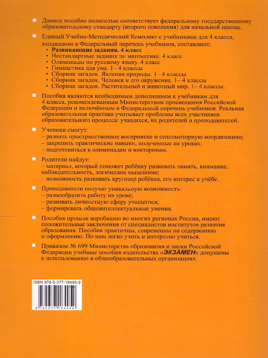 Курс развивающих занятий для младших школьников представляет собой комплекс специально разработанных тестов, игр и упражнений, направленных на развитие памяти, внимания, наблюдательности, логического мышления; способствует развитию пространственного восприятия и сенсомоторной координации.