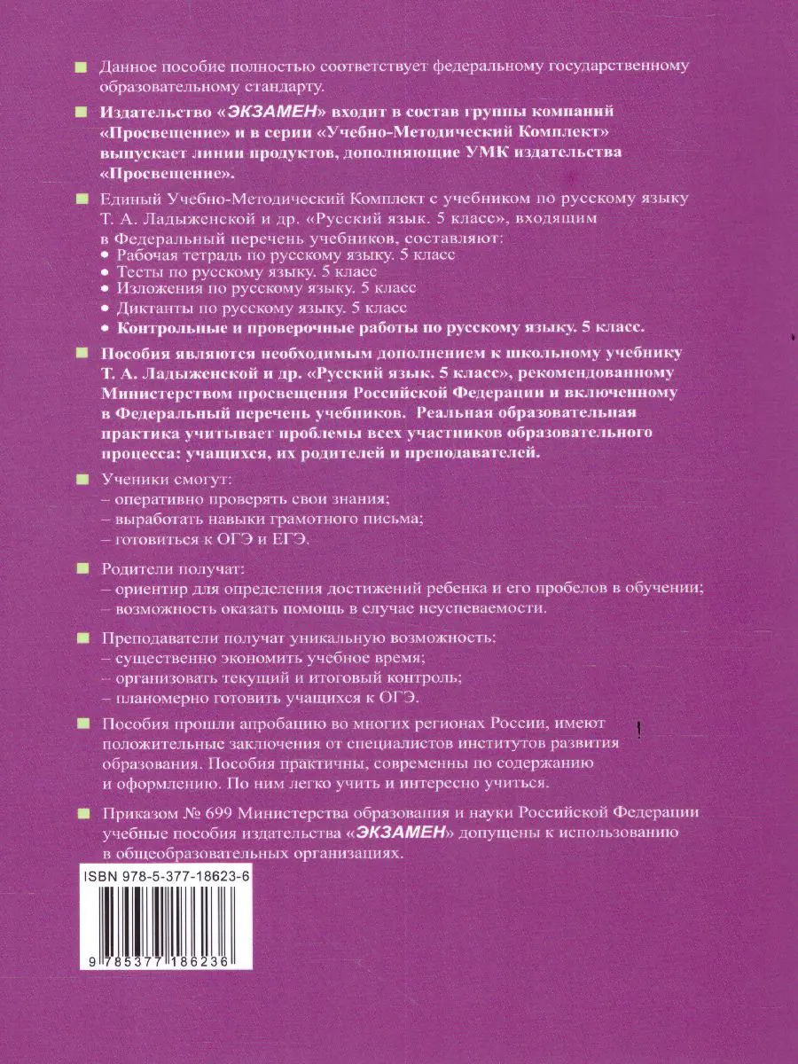 Русский язык. 5 класс. Контрольные и проверочные работы. УМК Ладыженской. ФГОС новый