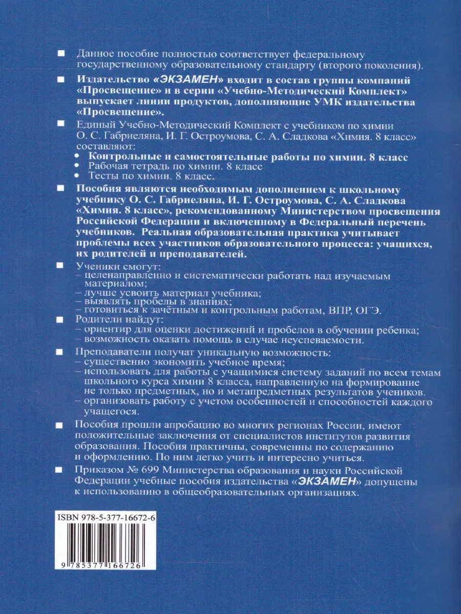 В пособии отражены требования ФГОС к результатам освоения химии в виде совокупностей не только предметных, но и метапредметных результатов учащихся. Обширный дидактический материал может быть использован для индивидуальной самостятельной работы учащихся на уроках и дома.