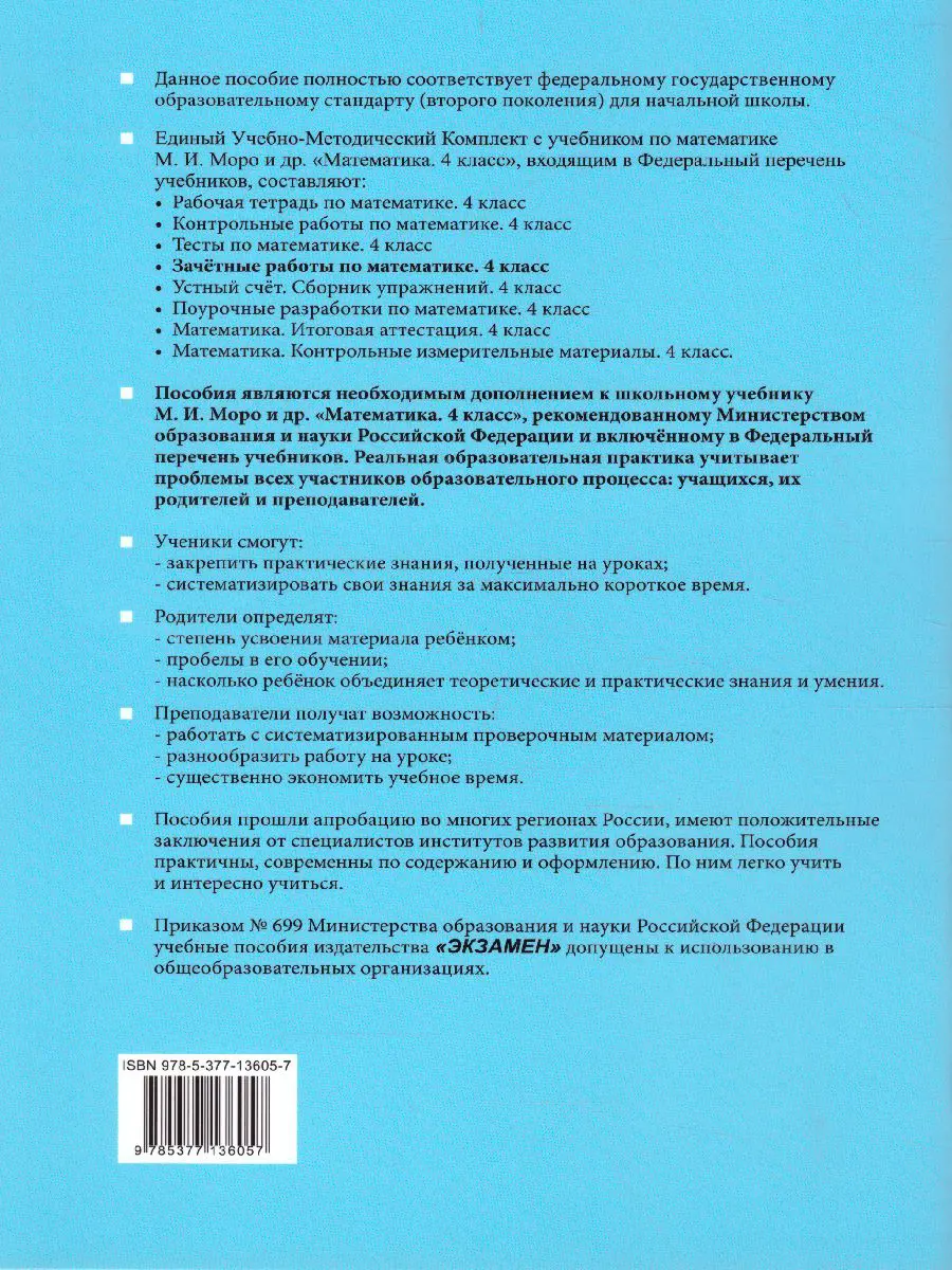 Данное пособие полностью соответствует федеральному государственному образовательному стандарту (второго поколения) для начальной школы. Пособие адресовано учителям начальной школы, родителям младших школьников, а также учащимся начальной школы для самостоятельных занятий и может быть использовано при работе с комплектом учебников по математике М.И. Моро и др. "Математика. 4 класс. В 2 ч.".