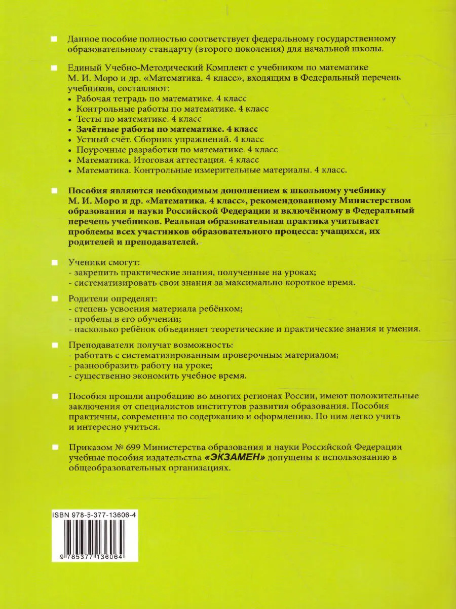 Данное пособие полностью соответствует федеральному государственному образовательному стандарту (второго поколения) для начальной школы. Пособие адресовано учителям начальной школы, родителям младших школьников, а также учащимся начальной школы для самостоятельных занятий и может быть использовано при работе с комплектом учебников по математике М.И. Моро и др. "Математика. 4 класс. В 2 ч.".
