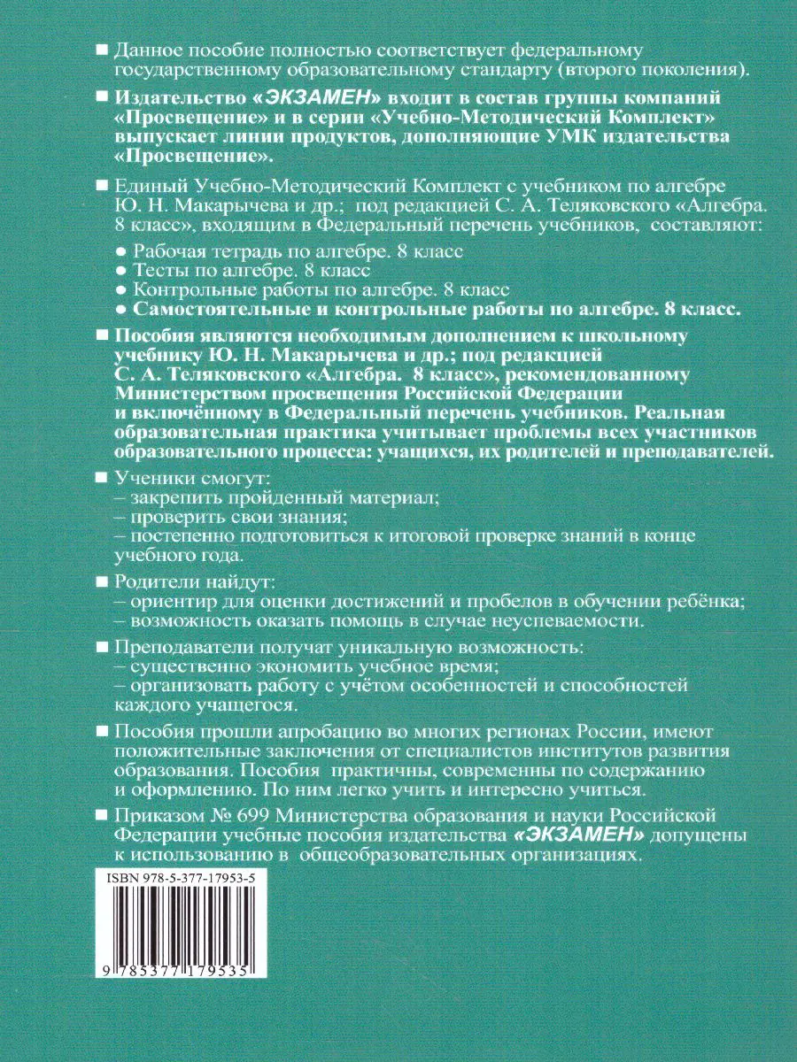 Пособие является необходимым дополнением к школьному учебнику Ю. Н. Макарычева и др. "Алгебра. 8 класс" (издательство "Просвещение"), рекомендованному Министерством образования и науки Российской Федерации и включенному в Федеральный перечень учебников.