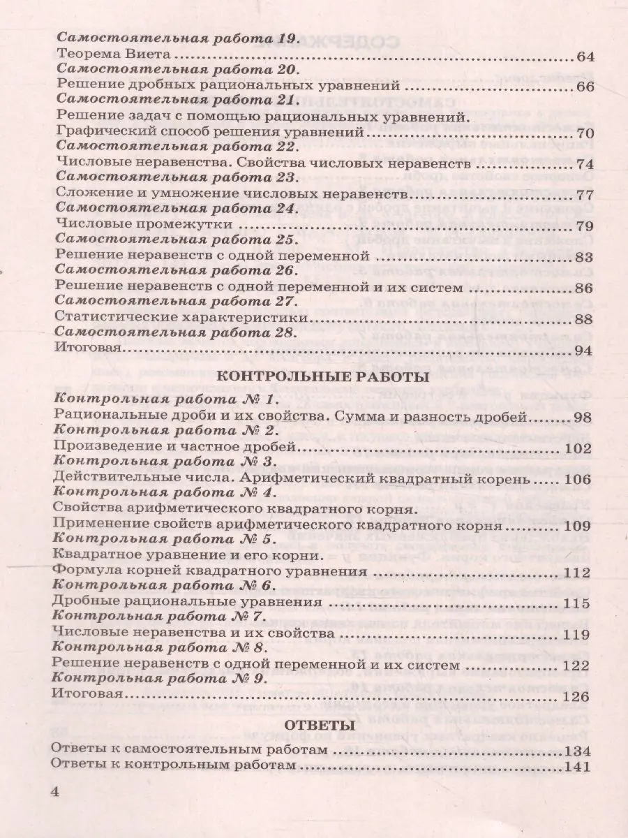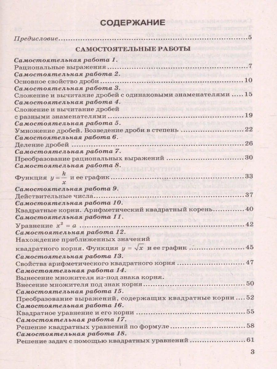 Сборник содержит тексты 28 самостоятельных и 9 контрольных работ для формирования знаний, умений и навыков учащихся, предусмотренных программой курса алгебры 8 класса, и текущего контроля результатов обучения. Каждый текст самостоятельной и контрольной работы представлен в 4 равной трудности вариантах. В сборник включены также ответы к заданиям, рекомендации по подсчету баллов и выставлению отметок. Планируемое время выполнения каждой самостоятельной работы - 30 минут, каждой контрольной работы - 40 минут.