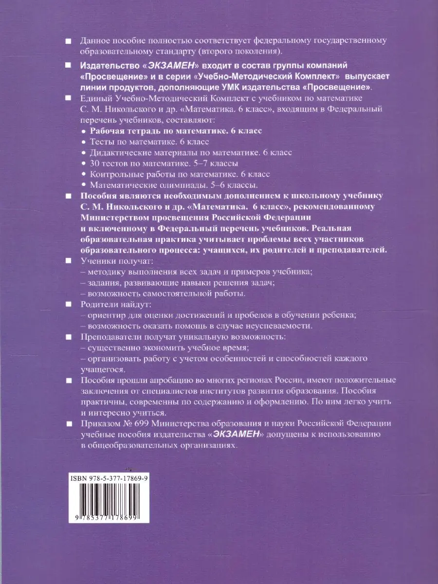 Рабочая тетрадь является необходимым дополнением к школьному учебнику С. М. Никольского и др. "Математика. 6 класс" (издательство "Просвещение"), рекомендованному Министерством образования и науки Российской Федерации и включенному в Федеральный перечень учебников.