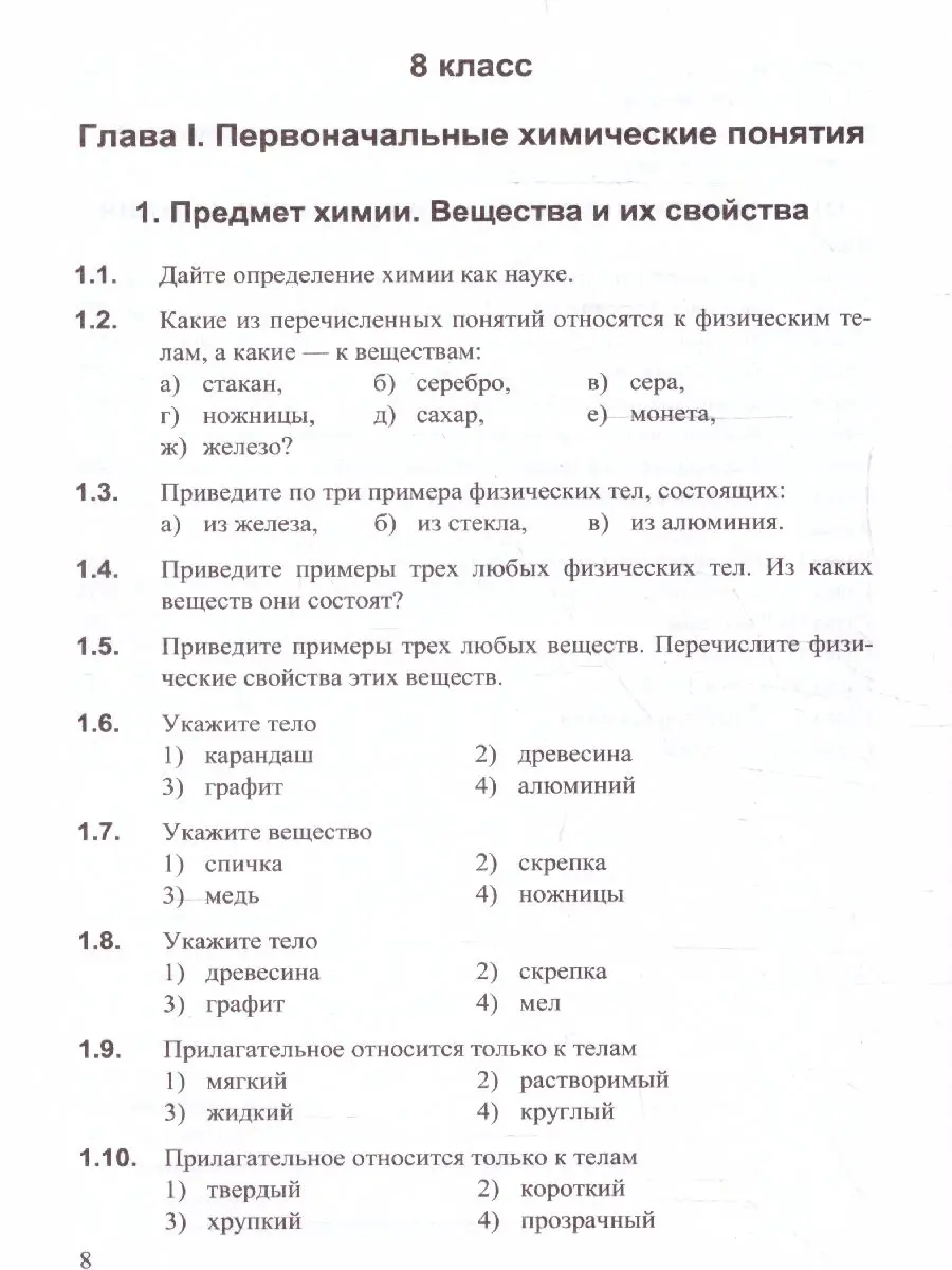 В пособии приводятся вопросы, задачи и тесты по химии для учащихся 8-9 классов. Содержание пособия соответствует учебникам Г. Е. Рудзитиса, Ф. Г. Фельдмана "Химия. 8 класс" и "Химия. 9 класс". По каждому параграфу учебников в пособии приводятся вопросы, задания и задачи по химии, при этом нумерация разделов пособия совпадает с нумерацией параграфов учебников.
