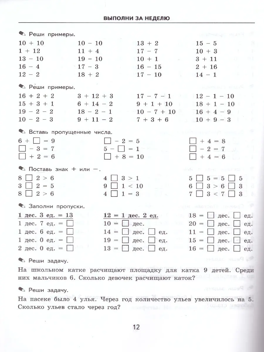 В пособии представлены разнообразные задания по математике за курс 1 класса. Каждая работа рассчитана на недельную нагрузку. Работа с данным пособием позволит повысить интерес к изучению математики, будет способствовать развитию логического мышления, пространственных представлений и воображения.