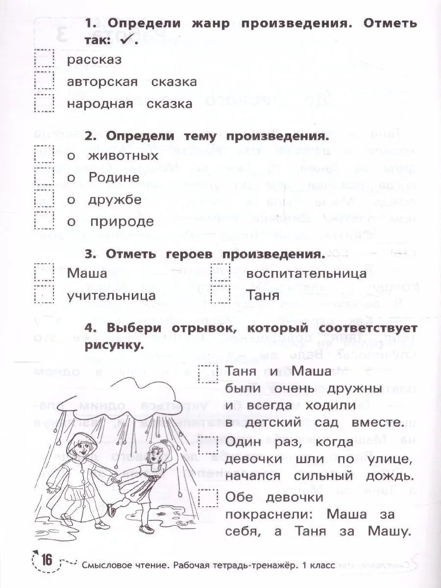 Данное учебное пособие предназначено для проверки навыков смыслового чтения учащихся 1 класса. Материалы пособия могут быть использованы и для контрольной проверки полученных знаний и навыков, и на уроках по основным предметам.