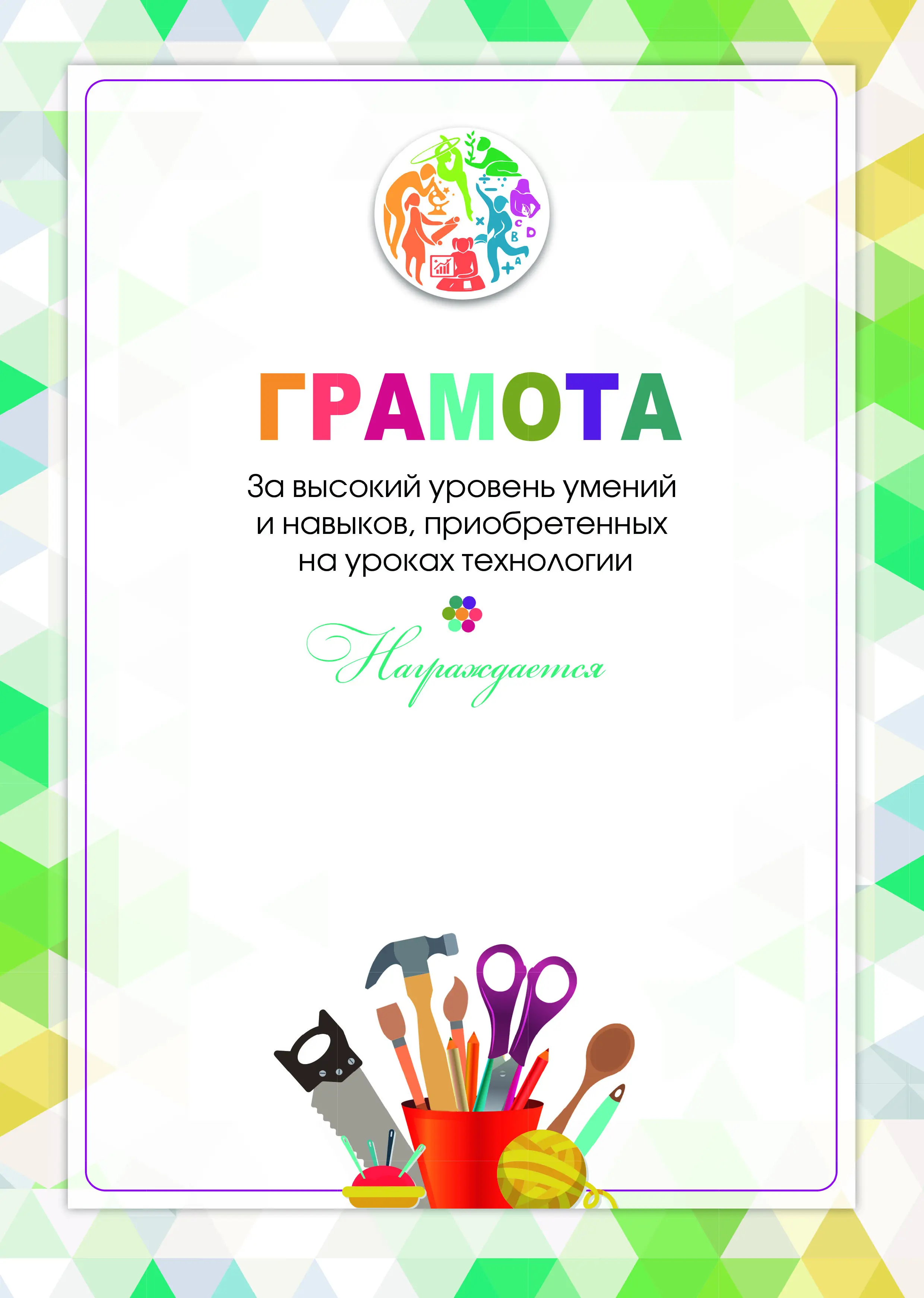 Грамота. За высокий уровень умений и навыков, приобретенных на уроках технологии.* (Зеленая)