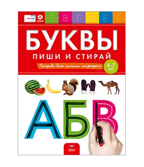 Учиться писать буквы — очень увлекательное занятие. Попробуйте сами: напишите маркером букву в этой тетради, сначала по стрелочкам, затем самостоятельно. Хорошо получилось? Все красивые буквы оставляйте, а остальные просто стирайте. Благодаря картинкам, пунктирным буквам и прочим подсказкам ваш ребенок прекрасно справится с этой задачей. Незаметно для себя он напишет каждую букву много раз и доведет ее почти до совершенства. На ламинированных страницах этой тетради можно писать маркерами и фломастерами. Они чисто стираются ватным диском или влажной салфеткой. Поэтому писать и стирать в тетради можно столько, сколько захочется!