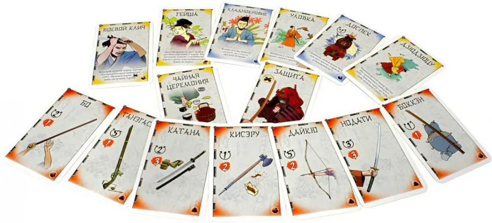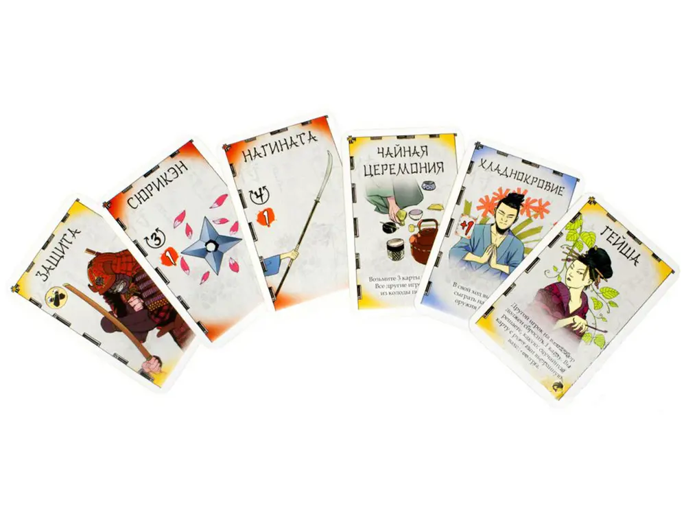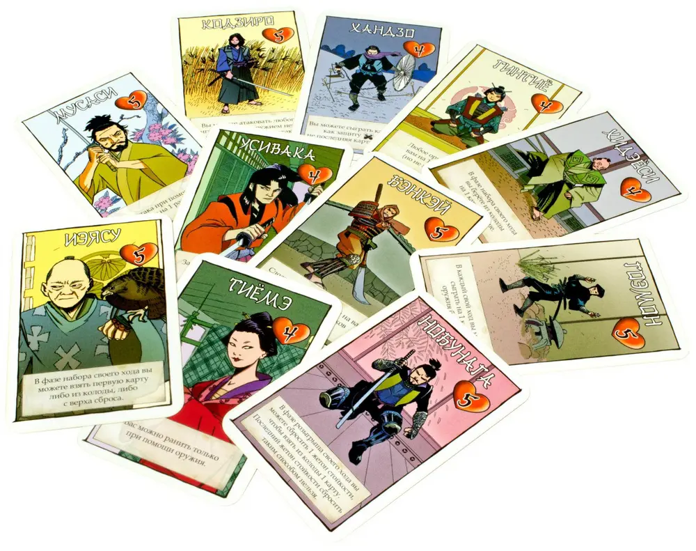 1. сёгун и самураи (количество самураев зависит от числа игроков);2. ниндзя (2 или 3, в зависимости от числа игроков);3. ронин, всегда играющий в одиночку.Ваша цель — либо набрать совместно с другими участниками вашей команды как можно больше победных очков, либо сделать так, чтобы последним выжившим оказался игрок из вашей команды.