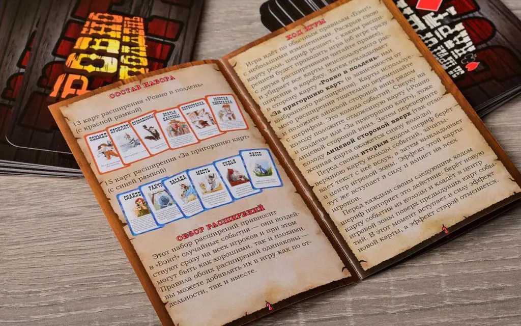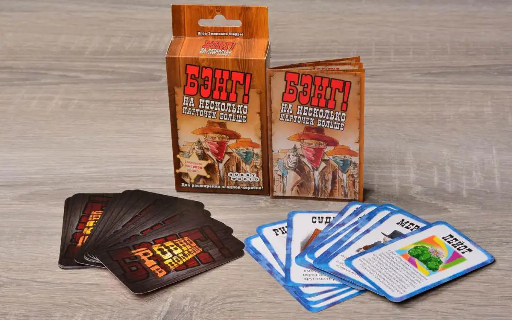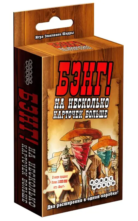 «Бэнг! На несколько карточек больше» — это небольшое дополнение для культовой настольной игры «Бэнг!». Теперь ковбои подвержены новым независимым событиям, которые уж точно повлияют на ход всей партии! Мёртвые восстают из могил, в город прибывает поезд, не упокоенные духи бродят по улицам, а в салунах играют в русскую рулетку.