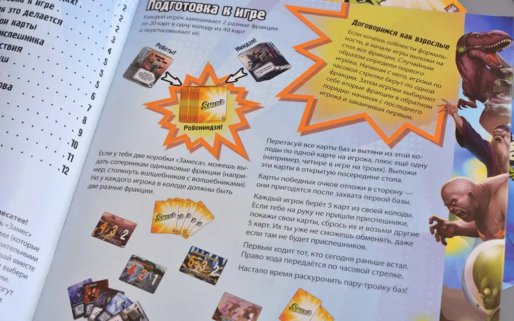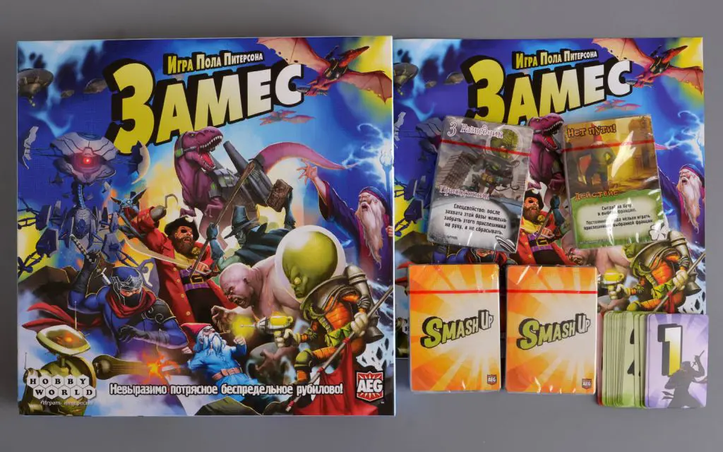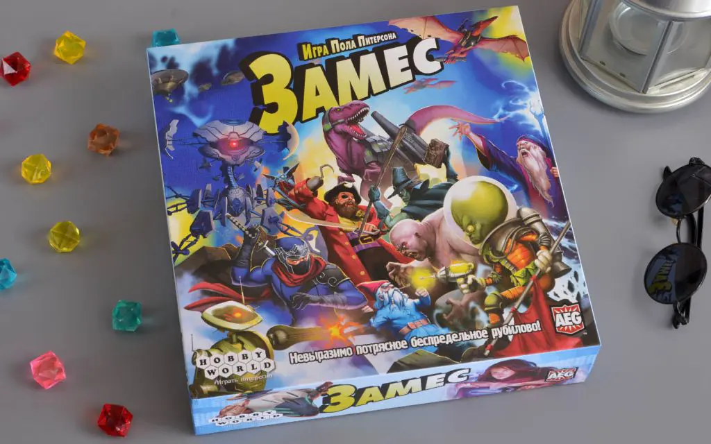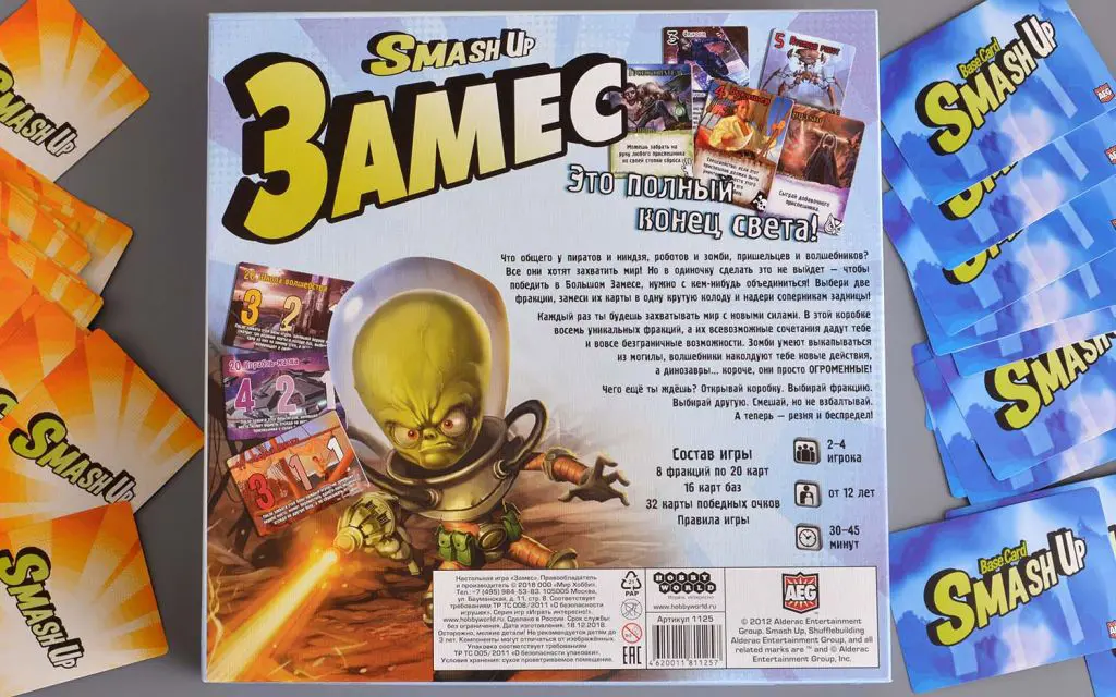 Настольная игра Hobby World «Замес» представляет карточный бой между разными фракциями от волшебников и ниндзя до зомби и пришельцев. Каждый вид героев имеет свои преимущества, например, зомби восстают из земли, а колдуны создают заклинания. Карты фракций перемешиваются, что открывает больше возможностей для победы.