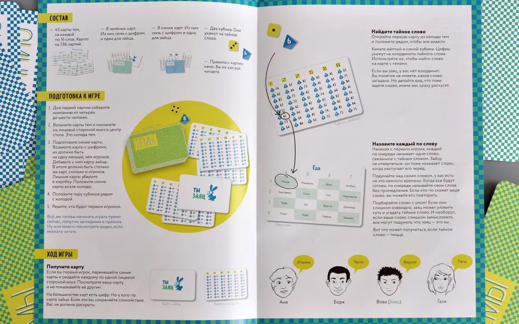 Это игра про блеф и маскировку. Все знают тайное слово. Кроме одного Ц он едет зайцем. Зайцев никто не любит, и нужно его найти. А зайцу нужно притвориться, что он как все, и не спалиться. У всех, кроме одного, на карте тайная тема. Все по очереди называют слово на эту тему. Нужно подобрать такое слово, чтобы не выдать тему явно. Зайцу нужно назвать слово, похожее на остальные. Иначе он себя выдаст. Когда все назвали по слову, голосуйте, кто, по-вашему, ехал зайцем. Если угадали, можете себя поздравить. Вы разбираетесь в людях. Если нет, побеждает безбилетник – поздравьте его, он разбирается в вас.