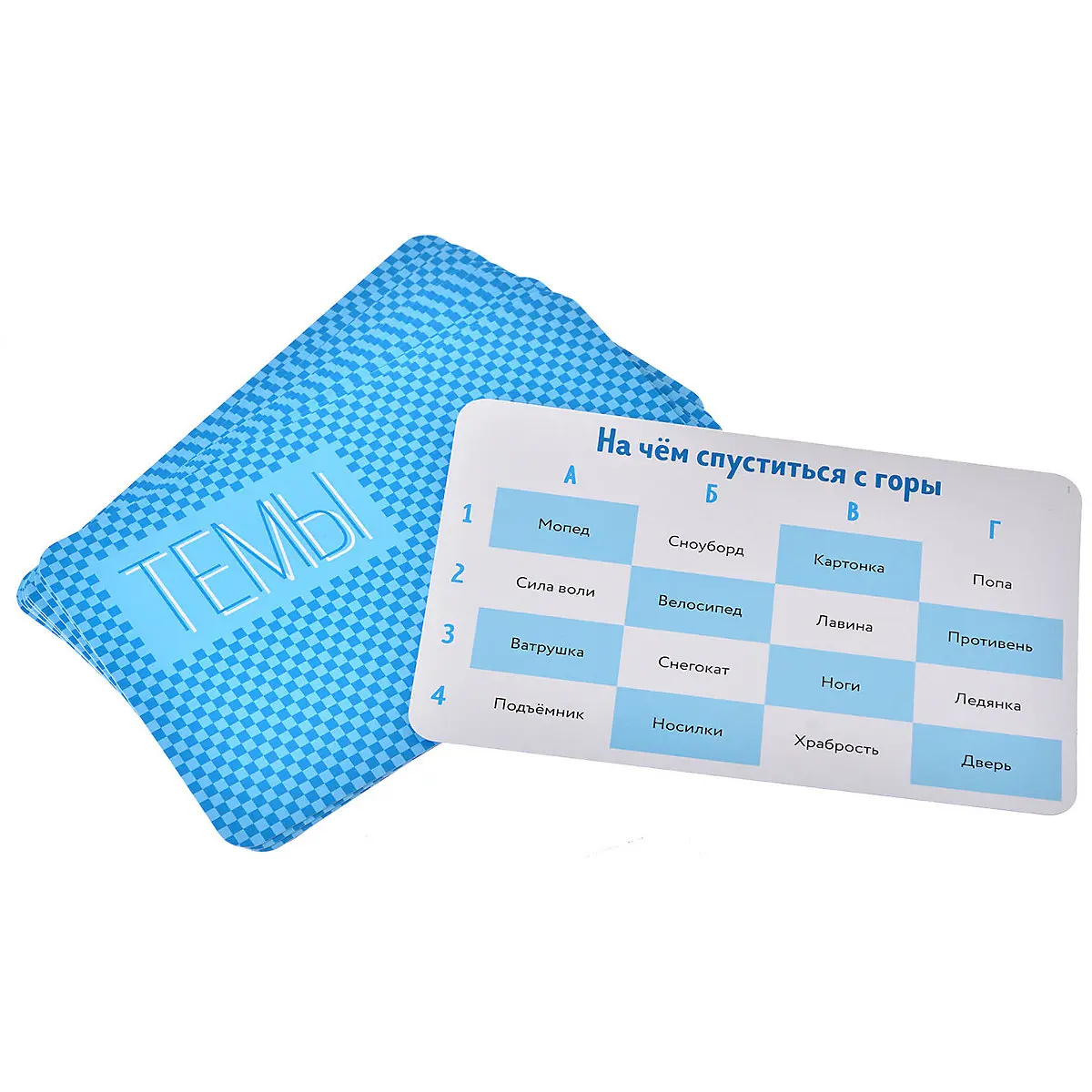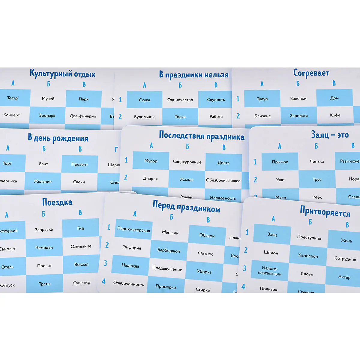 Это дополнение к "Зайцу", внутри – 21 новая карточка про праздники и отдых. На каждой карточке по 16 слов. Все очень знакомые и вызывают море ассоциаций: салаты, зимние развлечения, каникулы, чемоданы в отпуск, свадьба в ресторане, новогодние чудеса, подарки.