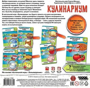 Настольная игра Hobby World «Кулинариум» - здесь творится настоящая магия, от которой пахнет специями, мясом и куриной подливой. Вам по душе японские блюда? Почему бы не сделать суши и курицу в темпуре! Или лучше голубцы в томатном соусе? Возможно всё, были бы ингредиенты, рецепт и желание. В настольной игре «Кулинариум» вы будете греметь на кухне кастрюлями, сковородами и ножами, творя кулинарные шедевры. Берите ингредиенты из холодильника и готовьте блюда разных народов мира. Из нескольких кушаний можно приготовить полноценный обед, а блюда — взять у других игроков. Тот, кто наберёт больше всего очков, станет лучшим поваром! И советуем играть на сытый желудок.
