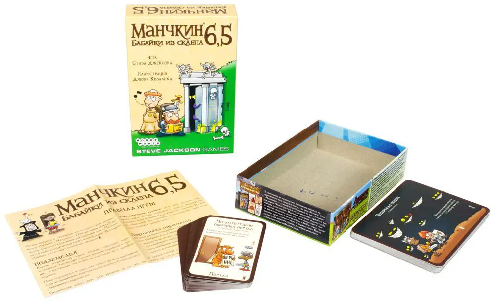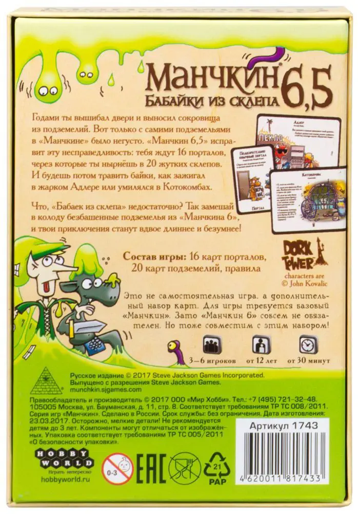 Годами ты вышибал двери и выносил сокровища из подземелий. Вот только с самими подземельями в «Манчкине» было негусто. «Манчкин 6,5» исправит эту несправедливость: тебя ждут 16 порталов, через которые ты нырнёшь в 20 жутких склепов. И будешь потом травить байки, как зажигал в жарком Адлере или умилялся в Котокомбах.