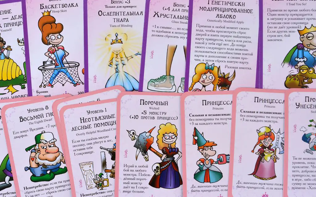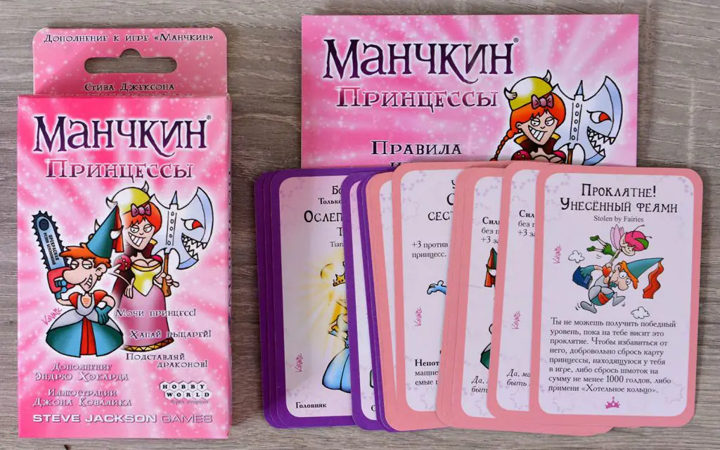 В краю манчкинизма воцарилась монархия! Но местным принцессам в замке не сидится. В хрустальных туфельках на остром каблуке и с диким топором наперевес они лупят всех, кого встретят на пути: драконов, злобных мачех и прекрасных принцев в придачу. Замешай «Принцесс» в классический «Манчкин», и твоя подземельная быль станет настоящей сказкой!