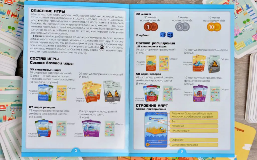Добро пожаловать в город мечты, который создаёте вы сами, приобретая карты и бросая кубики. Высаживайте сады и цветники, воздвигайте пекарни и сыроварни, магазины и фабрики, а главное — стройте достопримечательности, чтобы заманить в город туристов. Однако расслабляться нельзя — по соседству уже растут другие города, и их мэры тоже жаждут славы и признания. Проявите прозорливость и смекалку, и вы выиграете гонку за титул лучшего градоначальника в захватывающей японской игре «Мачи коро».