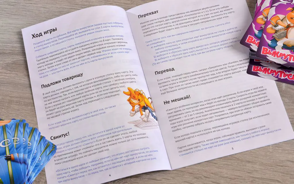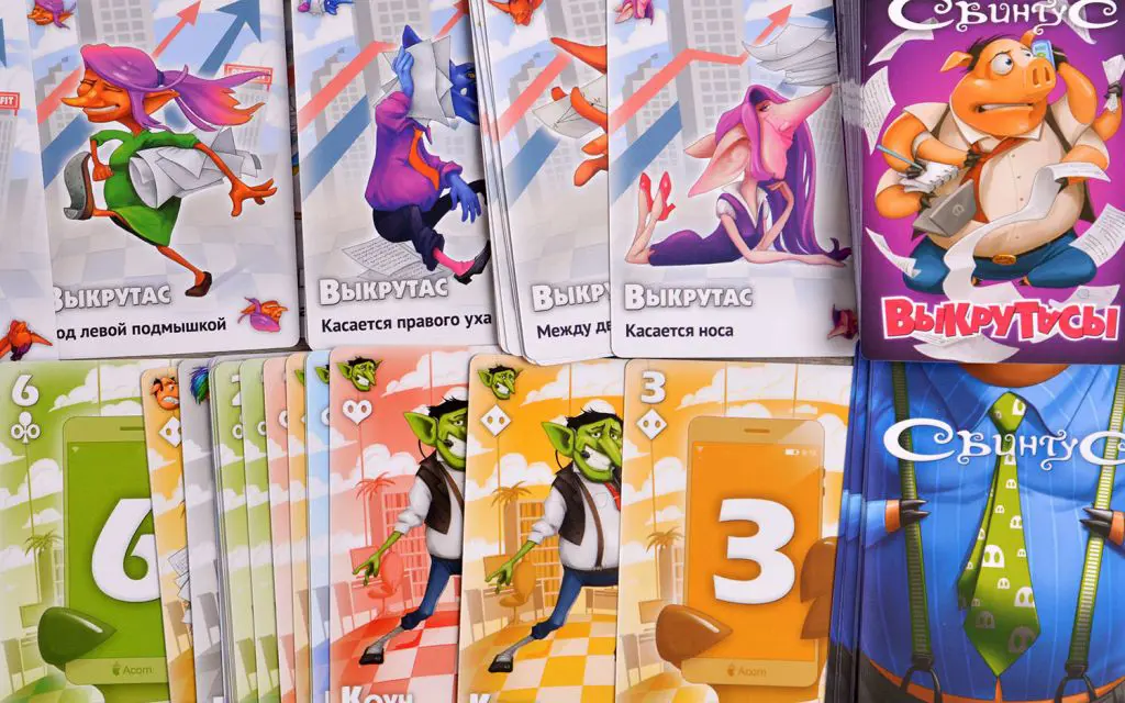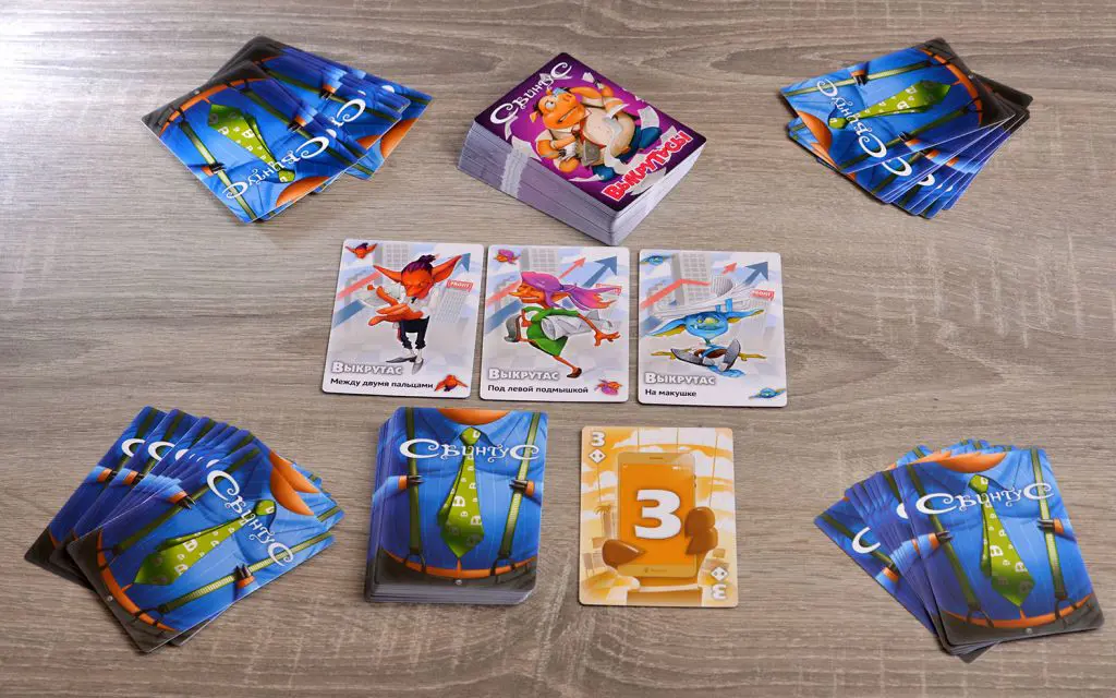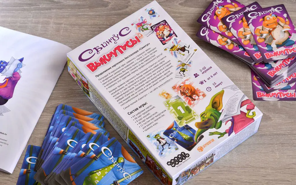 Правила игры: базовые правила карточного бестселлера «Свинтус» остаются незыблемыми. Чтобы сыграть с выкрутасами, бывалым свинтусам достаточно прочитать текст, выделенный синим цветом. Разделите карты по рубашке. Все карты выкрутасов (кроме пустых) соберите в стопку выкрутасов. Перемешайте её, выложите на стол 3 карты выкрутасов лицом вверх, а оставшуюся стопку положите рядом лицом вниз. Соберите цифровые карты, карты предписаний и коучей в игровую колоду. Тщательно перемешайте её и сдайте каждому игроку по 8 карт. Положите колоду на середину стола лицом вниз. Раздающий игрок открывает верхнюю карту колоды и кладёт её рядом лицом вверх, закладывая начало игровой стопки