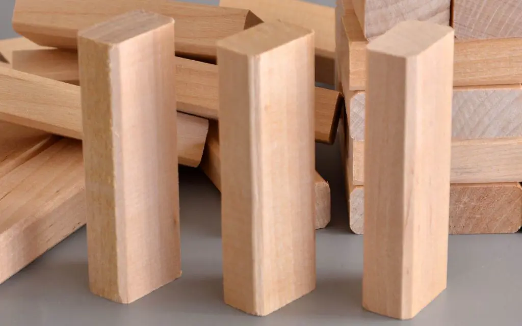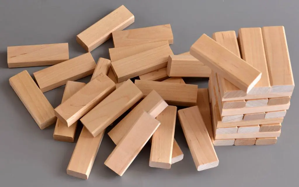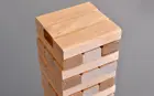 По очереди тяните бруски из башни одной рукой. Не трогайте три верхних уровня;