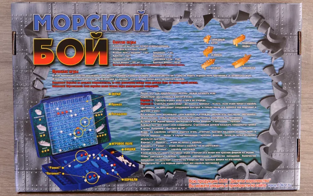 Торпеды рассекают волны, подлодки крадутся по дну, мины ждут добычу. Взрывы, пламя и океан... Именно таким представляется Морской бой, даже если играешь в него тайком от учителя, рисуя поля на последней странице тетрадки. А уж как он выглядит на пластиковом игровом планшете! Тут тебе и фигурки кораблей, и расчерченные поля, и удобные фишки промахов и ранений. Топить вражескую эскадру стало вдвое приятнее.