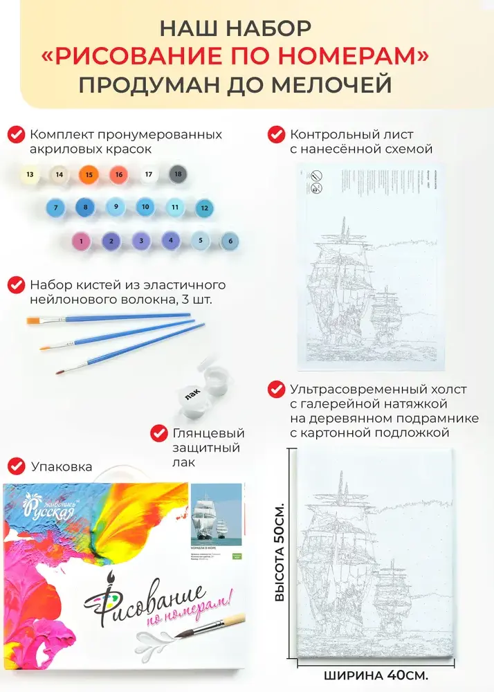 Набор для рисования по номерам позволит любому желающему приобщиться к искусству живописи. А готовый шедевр станет эффектным украшением интерьера или отличным подарком ценителю прекрасного. Процесс росписи прост. Рисунок разделён на множество мелких фрагментов, на каждом указано число. Оно соответствует цвету, которым нужно заполнить данный участок. В набор входят все необходимые оттенки красок. Состав набора: грунтованный холст, деревянный подрамник, комплект пронумерованных акриловых красок, набор кистей из эластичного нейлонового волокна, контрольный лист с нанесённой схемой, защитный лак.