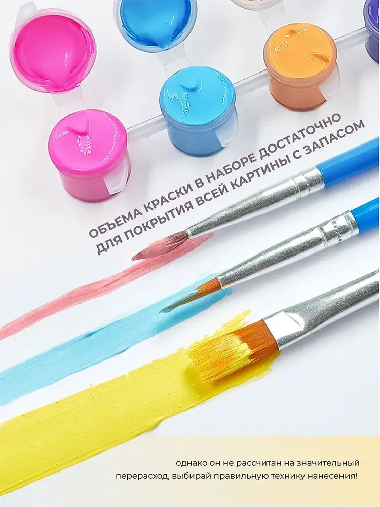 Набор для рисования по номерам позволит любому желающему приобщиться к искусству живописи. А готовый шедевр станет эффектным украшением интерьера или отличным подарком ценителю прекрасного. Процесс росписи прост. Рисунок разделён на множество мелких фрагментов, на каждом указано число. Оно соответствует цвету, которым нужно заполнить данный участок. В набор входят все необходимые оттенки красок. Состав набора: грунтованный холст, деревянный подрамник, комплект пронумерованных акриловых красок, набор кистей из эластичного нейлонового волокна, контрольный лист с нанесённой схемой, защитный лак.