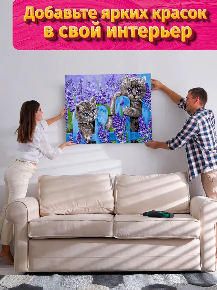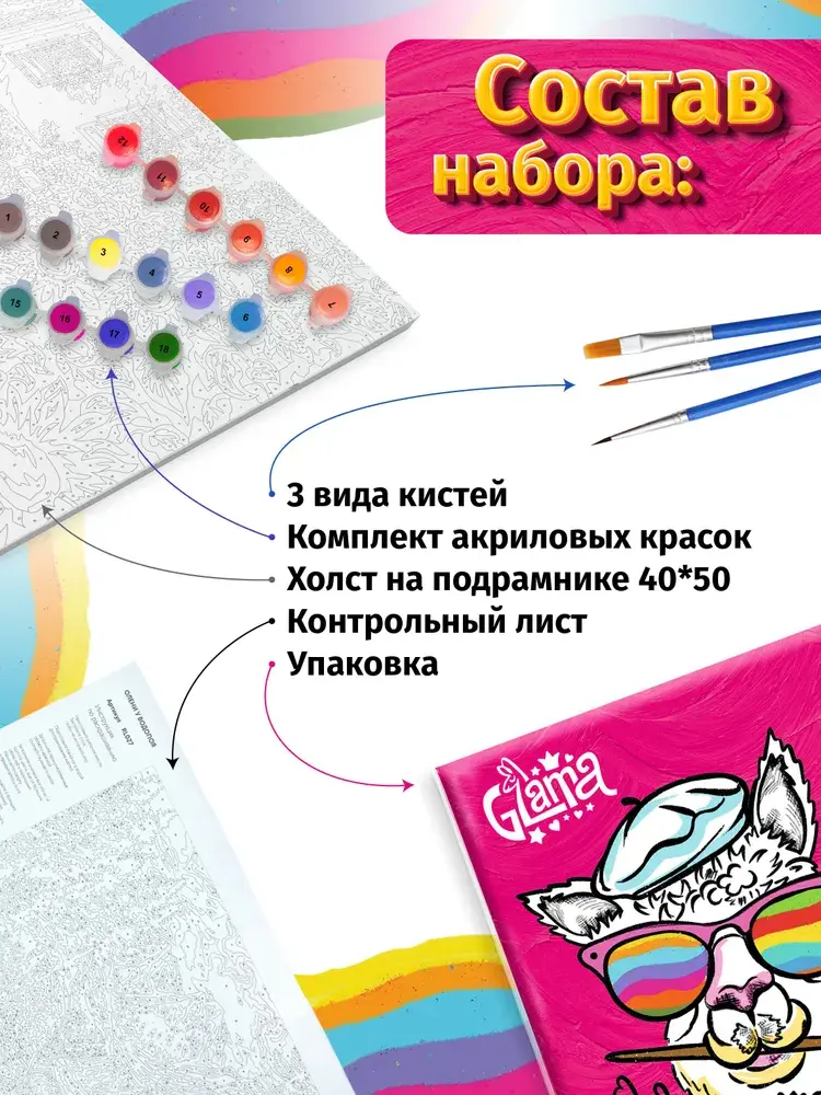 Набор для творчества содержит все, что нужно для рисования и релакса: грунтованный холст на подрамнике 40х50 см, набор красок в баночках, набор кисточек, контрольный лист-инструкция с нумерацией.