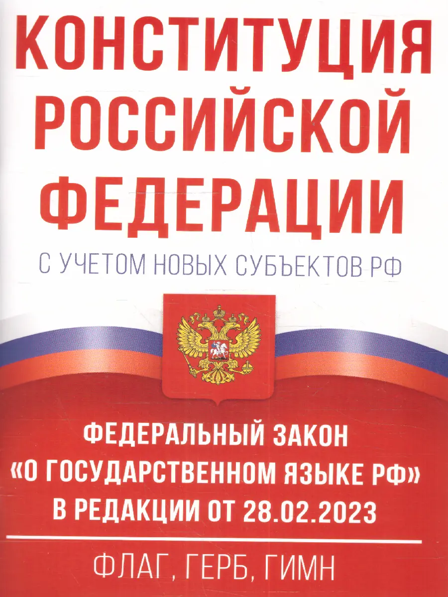 — официальный текст Конституции РФ с учетом образования в составе Российской Федерации новых субъектов: Донецкой Народной Республики, Луганской Народной Республики, Запорожской и Херсонской областей==— Федеральные конституционные законы "О Государственном флаге Российской Федерации", "О Государственном гербе Российской Федерации", "О Государственном гимне Российской Федерации"— Федеральный закон "О государственном языке Российской Федерации", включая поправки от 28.02.2023— текст Государственного гимна Российской Федерации.