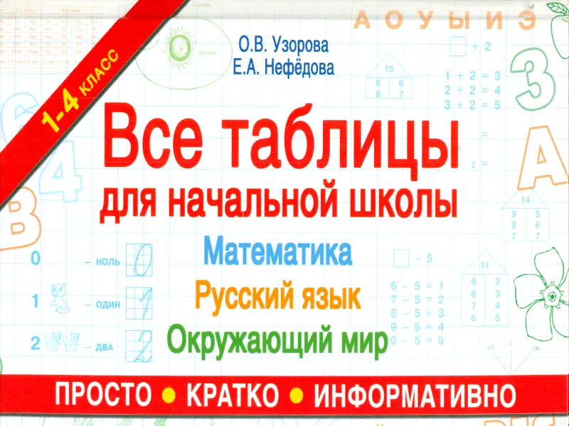 В учебном пособии известных педагогов О.В. Узоровой, Е.А. Нефёдовой "Все таблицы для начальной школы. Русский язык. Математика. Окружающий мир" в таблицах представлен материал для начальной школы по русскому языку, математике и окружающему миру.