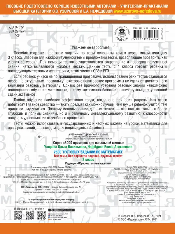 Пособие содержит тестовые задания по всем основным темам курса математики для 3 класса. Впервые для каждой изученной темы предложены тесты, позволяющие проверить, как ученик её усвоил. При помощи тестов осуществляются закрепление и проверка полученных знаний, чётко выявляются "слабые места". Данные тесты с первого класса готовят ребёнка к последующим тестовым испытаниям, в том числе к ОГЭ и ЕГЭ.