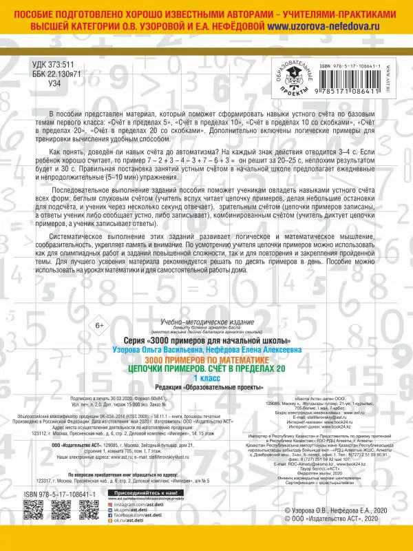 В пособии представлен материал, который поможет сформировать навыки устного счета по базовым темам первого класса: "Счет в пределах 5", "Счет в пределах 10", "Счет в пределах 10 со скобками", "Счет в пределах 20", "Счет в пределах 20 со скобками", а также логические примеры для тренировки вычисления удобным способом.