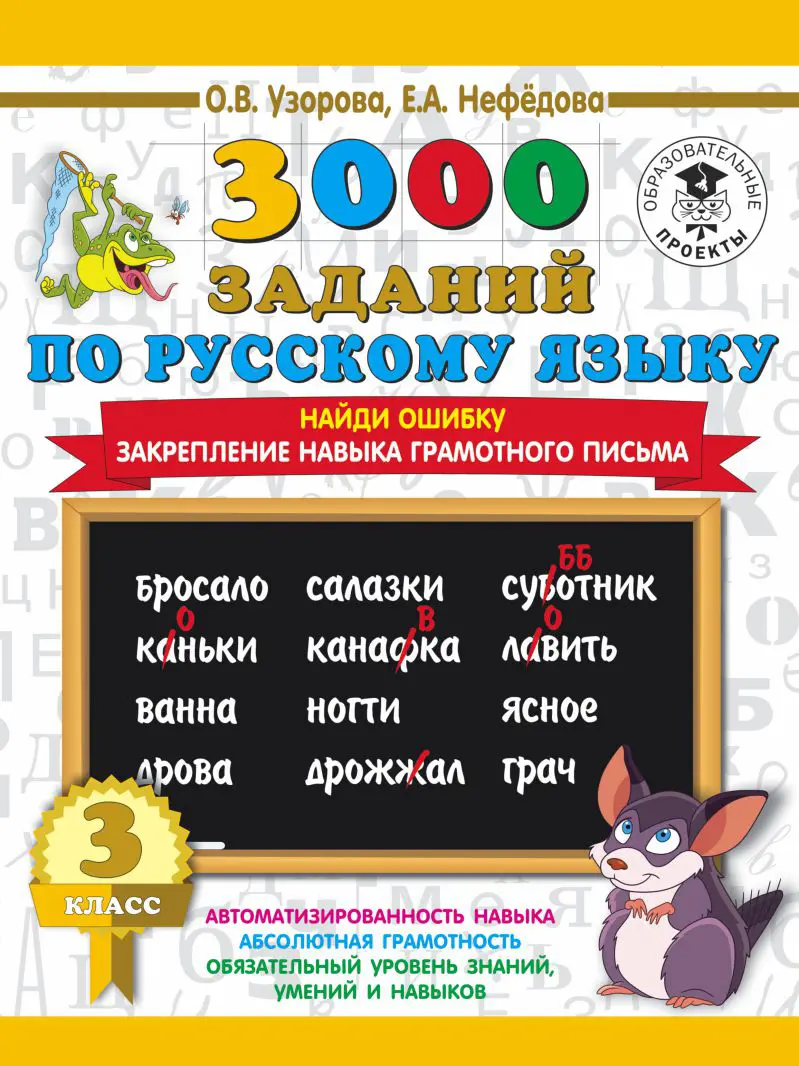 Пособие содержит 12 блоков примеров по всем основным темам программы по русскому языку для 3 класса. Задачи учащихся - найти и исправить орфографические ошибки в словах, что поможет им отработать и закрепить навыки грамотного письма.