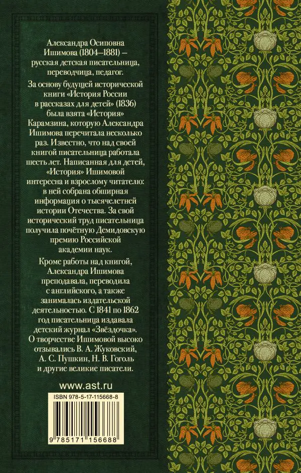 За основу будущей исторической книги "История России для детей" (1836) была взята "История" Карамзина, которую А.О. Ишимова перечитала несколько раз. Известно, что над своей книгой писательница работала шесть лет. Написанная для детей, "История" А. Ишимовой интересна и взрослому читателю: в ней собрана обширная информация о тысячелетней истории Отечества. За свой исторический труд писательница получила почётную Демидовскую премию Российской академии наук.