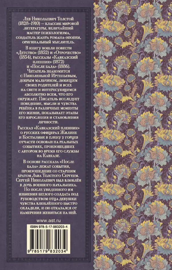 В книгу вошли повести "Детство" (1852) и "Отрочество" (1854), рассказы "Кавказский пленник" (1872) и "После бала" (1886).