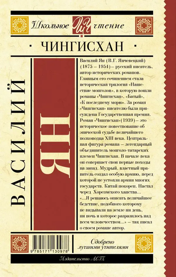Василий Ян (В.Г. Янчевецкий) (1875 – 1954) - русский писатель, автор исторических романов. Главным его сочинением стала историческая трилогия "Нашествие монголов", в которую вошли романы "Чингисхан", "Батый", "К последнему морю". За роман "Чингисхан" писателю была присуждена государственная премия.