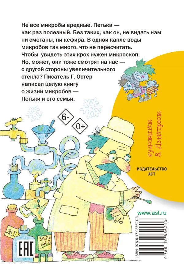 Не все микробы вредные. Петька -- как раз полезный. Без таких, как он, не видать нам ни сметаны, ни кефира. В одной капле воды микробов так много, что не пересчитать. Чтобы увидеть этих крох, нужен микроскоп. Но, может, они тоже смотрят на нас -- с другой стороны увеличительного стекла? Писатель Г.Остер написал целую книгу о жизни микробов -- Петьки и его семьи.