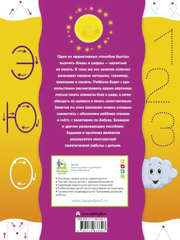 Занимаясь с этими прописями, ваш малыш будет охотно обводить крупные буквы и цифры и в процессе работы выучит алфавит, освоит счёт до 10, а также потренирует мелкую моторику, глазомер, внимание и память.