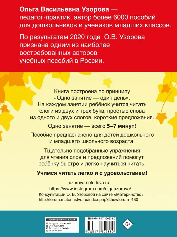 Книга "350 лучших упражнений для обучения чтению" известных педагогов-практиков О. В. Узоровой и Е. А. Нефёдовой построена по принципу одно занятие — один день. Занимаясь по этой книге всего 5–7 минут в день, ребёнок научится читать слоги из двух-трёх букв, простые слова и короткие предложения.
