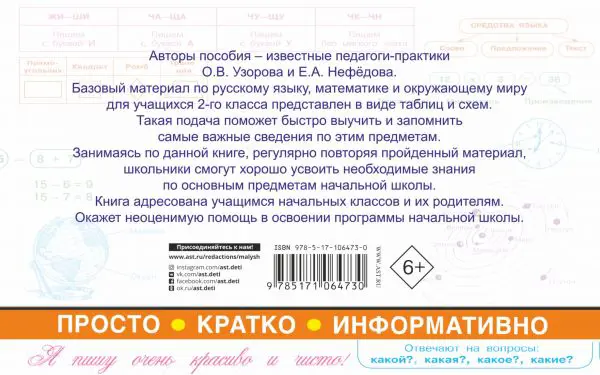 О чем эта книга Учебное пособие известных педагогов-практиков О. В. Узоровой и Е. А. Нефёдовой включает схемы и таблицы по русскому языку, математике и окружающему миру. Такая подача материала поможет школьникам быстро выучить и запомнить самые важные сведения по этим предметам. Кому эта книга будет интересна Школьникам начальных классов и их родителям. Каковы особенности этой книги • Весь материал представлен в виде таблиц и схем. • Регулярные повторения пройденного материала помогут школьнику усвоить необходимые знания по основным предметам. Книга адресована учащимся начальных классов и окажет неоценимую помощь в освоении программы начальной школы.