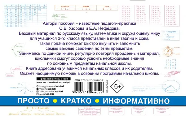 О чем эта книга Учебное пособие известных педагогов-практиков О. В. Узоровой и Е. А. Нефёдовой включает схемы и таблицы по русскому языку, математике и окружающему миру. Такая подача материала поможет школьникам быстро выучить и запомнить самые важные сведения по этим предметам. Кому эта книга будет интересна Школьникам начальных классов и их родителям. Каковы особенности этой книги • Весь материал представлен в виде таблиц и схем. • Регулярные повторения пройденного материала помогут школьнику усвоить необходимые знания по основным предметам. Книга адресована учащимся начальных классов и окажет неоценимую помощь в освоении программы начальной школы.